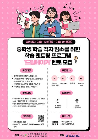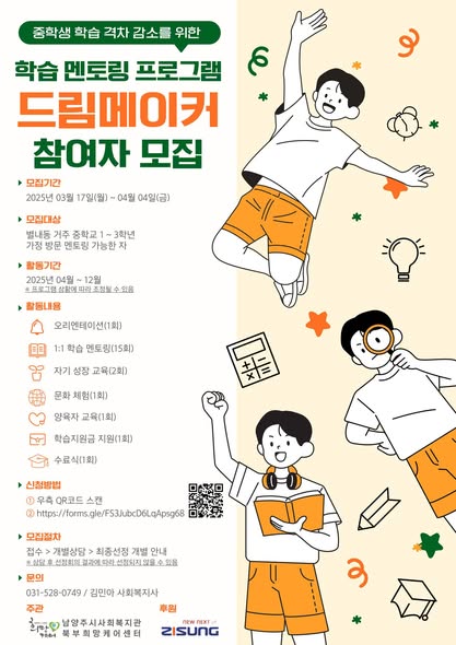 남양주시사회복지관 북부희망케어센터(센터장 전정수)는 '지성ECS' 후원으로 별내동 지역 내 학습 격차 해소가 필요한 중학생을 대상으로 학습 멘토링 프로그램 '드림메이커' 참여자와 멘토를 모집하고 있습니다.
