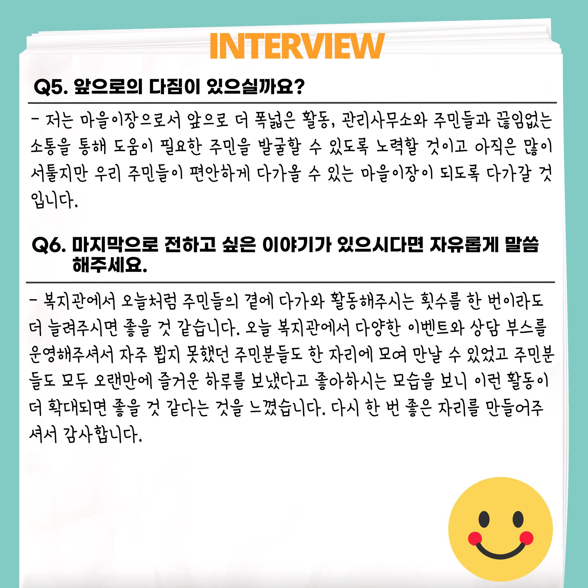 - 저는 마을이장으로서 앞으로 더 폭넓은 활동, 관리사무소와 주민들과 끊임없는 소통을 통해 도움이 필요한 주민을 발굴할 수 있도록 노력할 것이고 아직은 많이 서툴지만 우리 주민들이 편안하게 다가올 수 있는 마을이장이 되도록 다가갈 것입니다.