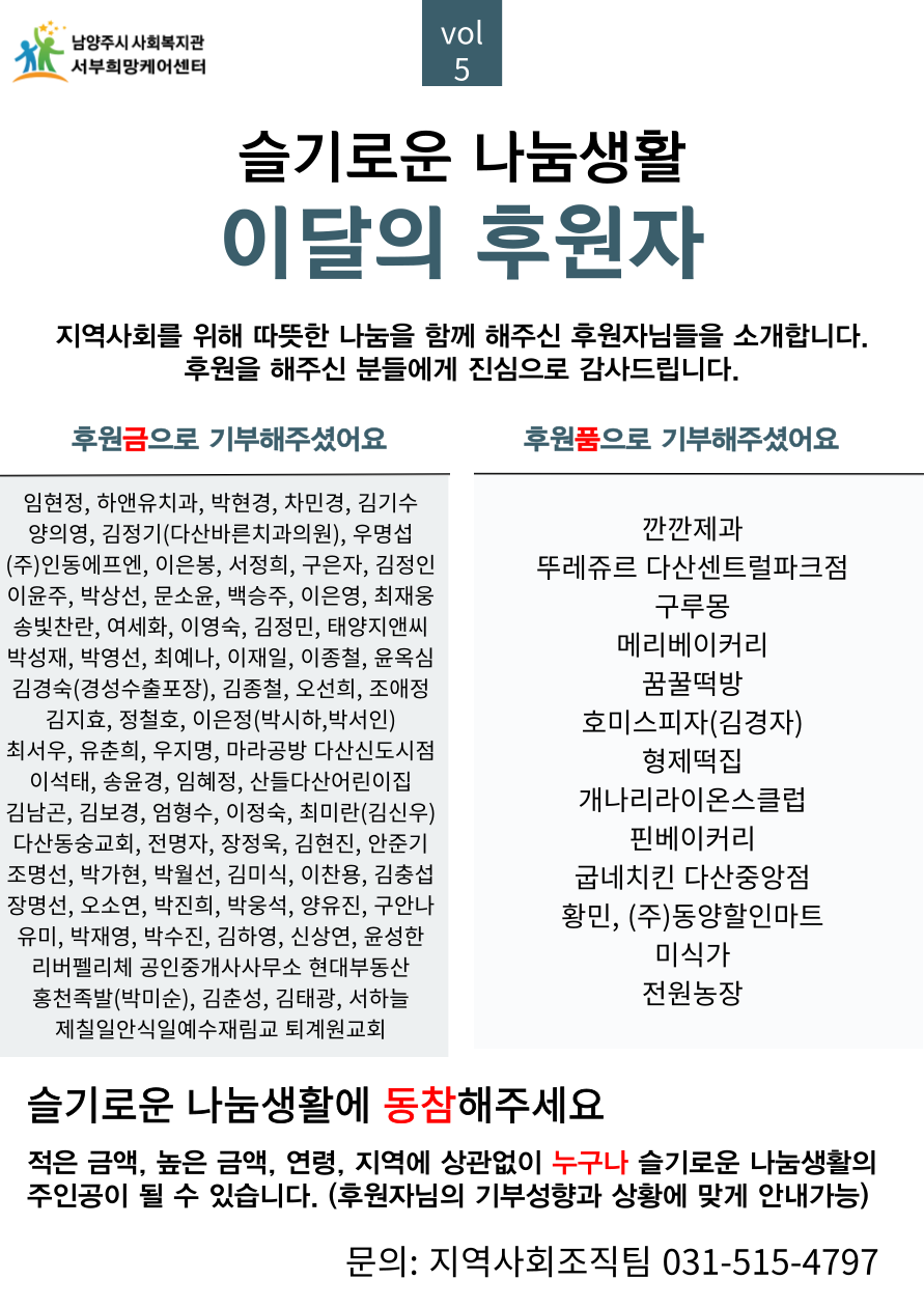 서부희망케어센터 [공시] 슬기로운 나눔생활, 이달의 후원자_5월 등록일자 2025-06-17 조회 146 내용 슬기로운 나눔생활, 이달의 후원자_5월2025년 5월에도웃음 가득한 지역사회를 만들기 위해총 93명(곳)의 후원자가 서부희망케어센터와 함께해 주셨습니다.나눔문화 확산을 위해자발적으로 나눔을 실천해 주신 후원자분들에게다시 한번 감사의 인사를 전하며,슬기로운 나눔 생활에 동참해 주실 분들은언제든지 031-515-4797로 연락 부탁 드립니다. 감사합니다. 첨부파일 이달의 후원자 5월.png [ Size : 309.76KB, Down : 68 ] 미리보기 다운로드 목록보기