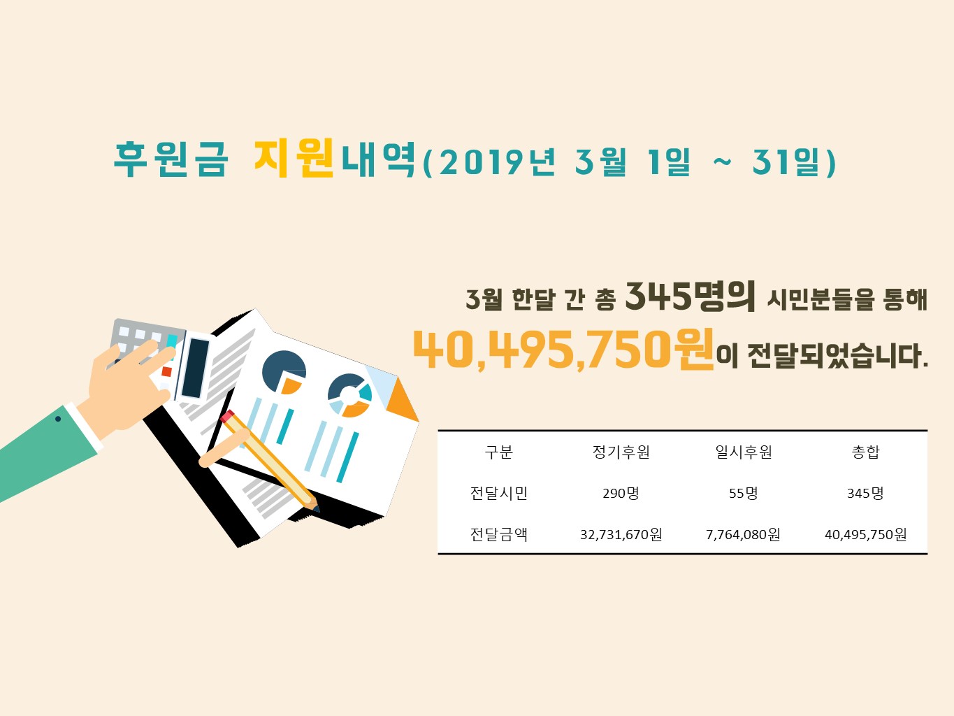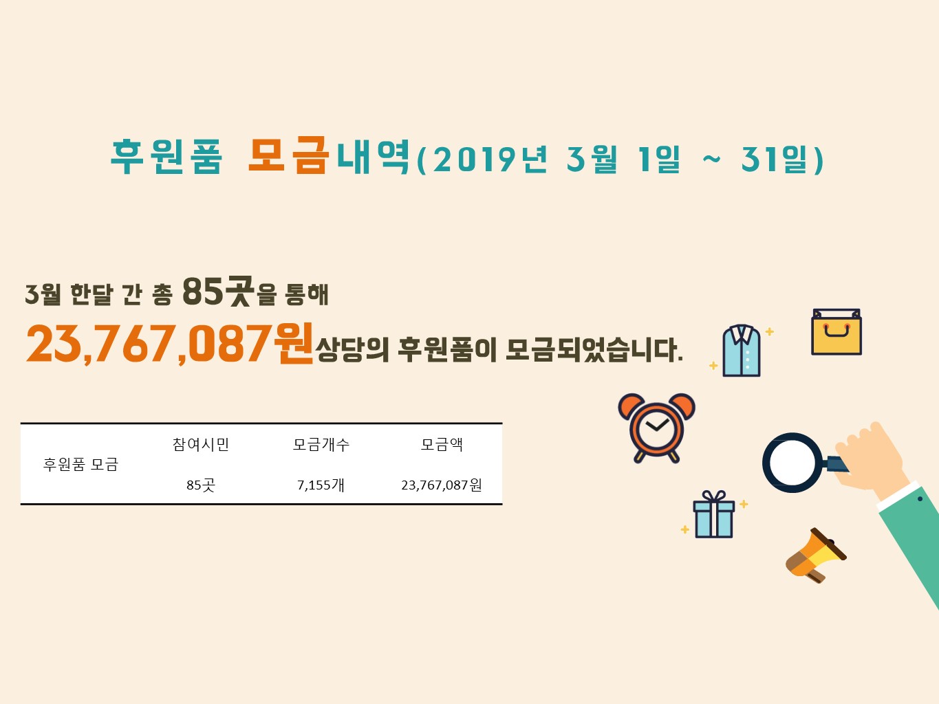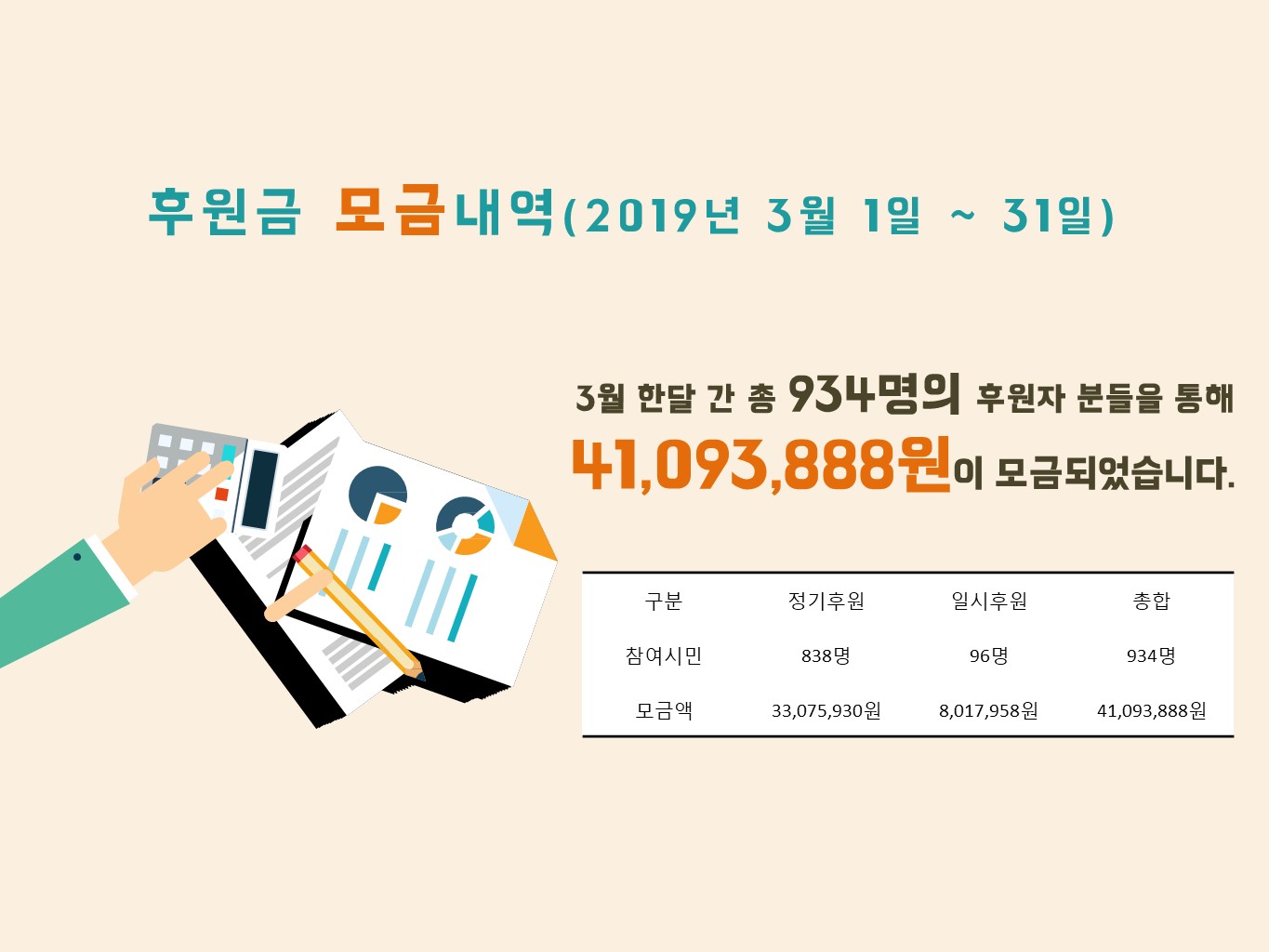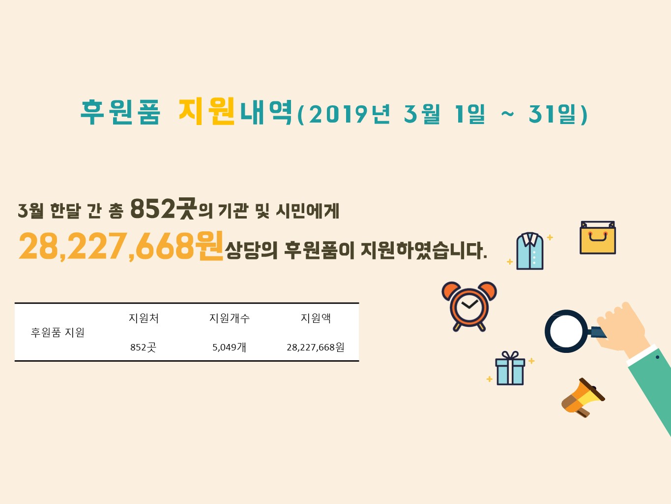 지난 2019년 3월 지역주민들이 함께 나누어주셨던 따뜻한 나눔현황을 보여드리고자합니다. 3월 한달 간 934명의 시민분들이 41,093,888원의 후원금을 85명의 시민분들이 23,767,087원 상당의의 후원품을 나누어주셨습니다. 항상 북부희망케어센터와 지역사회를 위해 나눔을 해주시는 모든 분께 감사드립니다. 자세한 내용은 이미지를 참고해주세요.