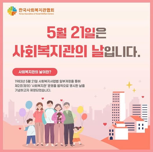 북부희망케어센터 5월 21일 사회복지관의 날 등록일자 2025-05-21 조회 113 내용 안녕하세요! 남양주시사회복지관 북부희망케어센터(센터장 전정수)입니다!1983년 5월 21일 사화복지사업법 일부 개정을 통해 제2조(정의)에 사회복지관 운영을 법적으로 명시한 날을 기념하고 제정되었는데요! 첨부파일 1.jpg [ Size : 36.76KB, Down : 55 ] 미리보기 다운로드 목록보기