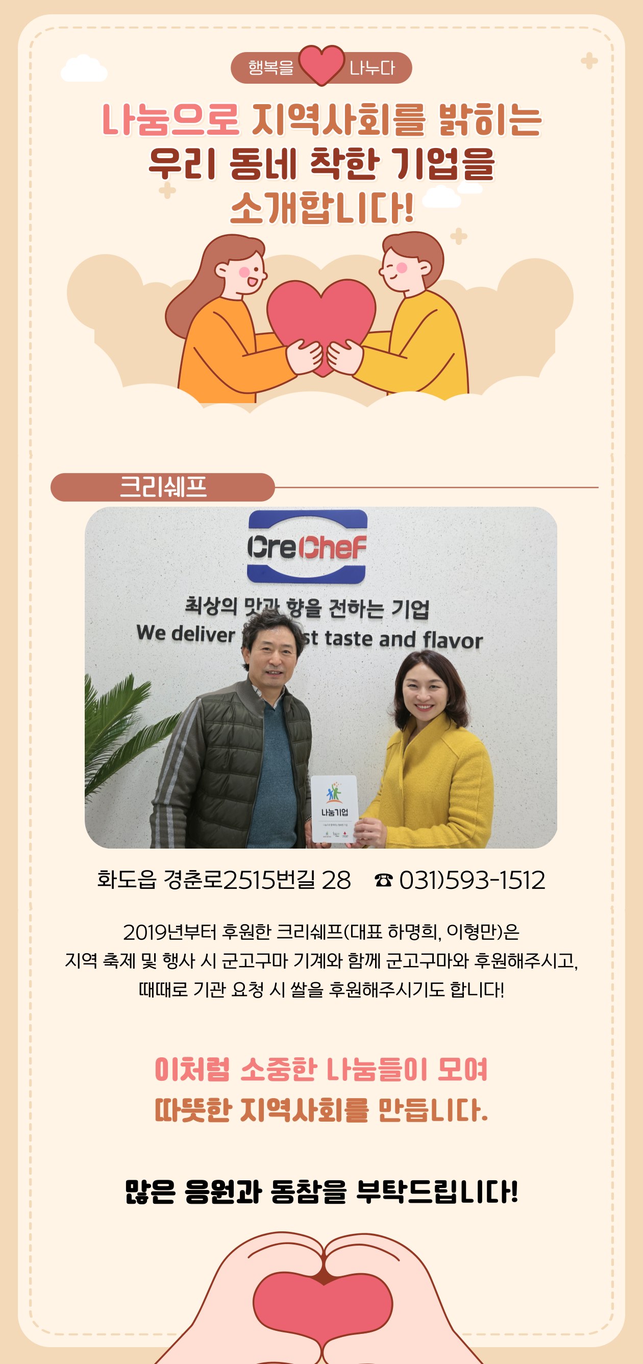 지역의 온도를 높여주는 크리쉐프의 마음에 진심으로 감사드리며, 앞으로도 함께 더 많은 따뜻한 이야기들을 만들어가겠습니다.