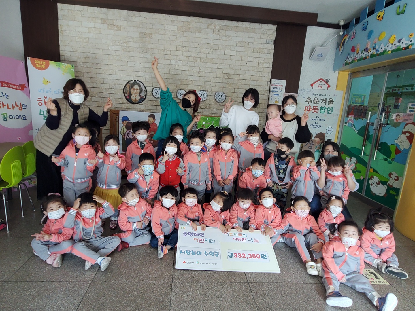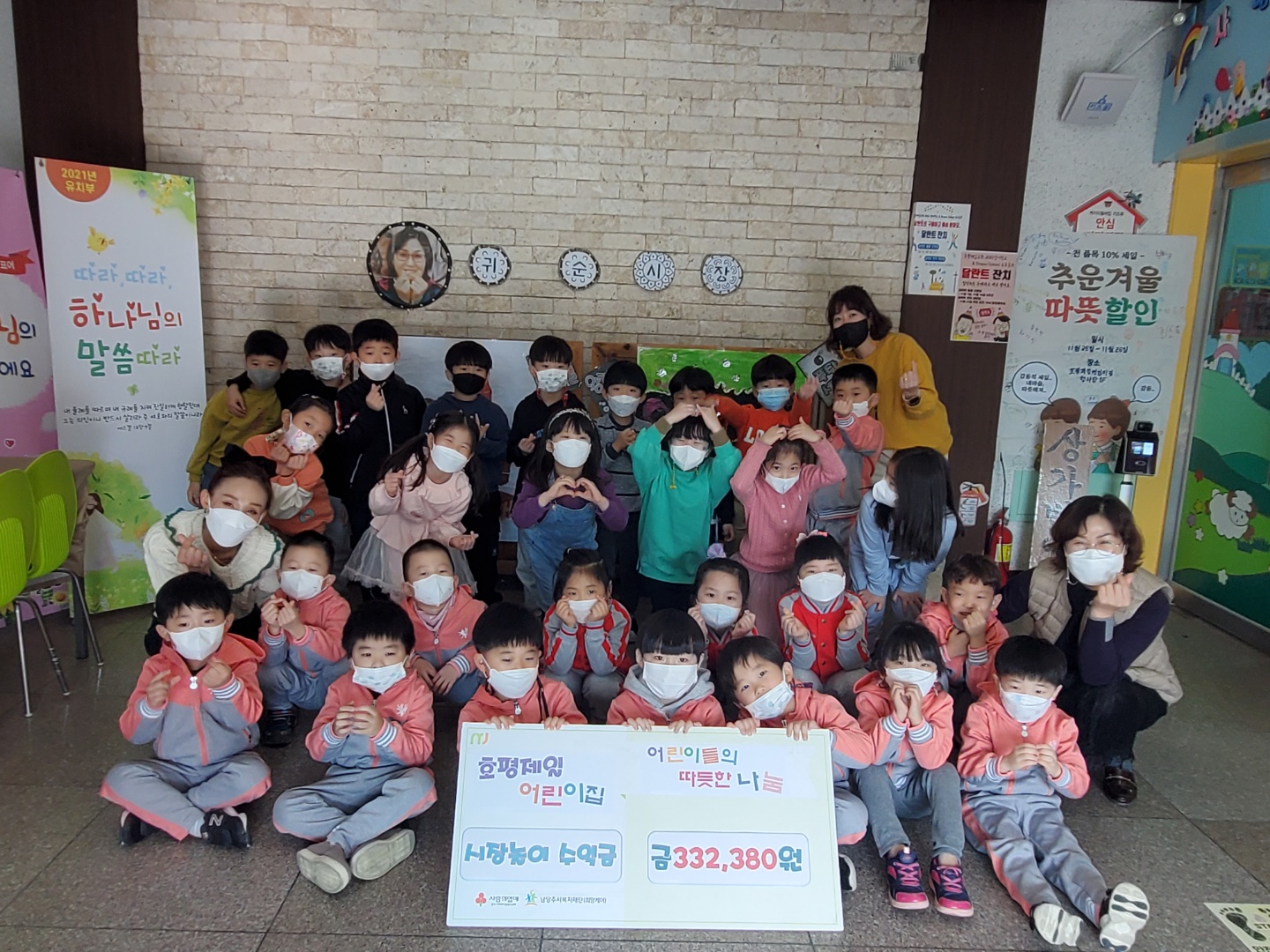 남양주시 호평동 호평제일어린이집(원장 김귀순)에서는 매해 원아들과 함께 시장놀이를 진행해 지역사회 소외된 이웃을 위한 후원금 기부를 해오고 있으며, 이번 시장놀이를 통해 마련된 수익금 350,780원 역시 남양주시복지재단 동부희망케어센터를 통해 사회복지공동모금회에 기탁해 주셨습니다.