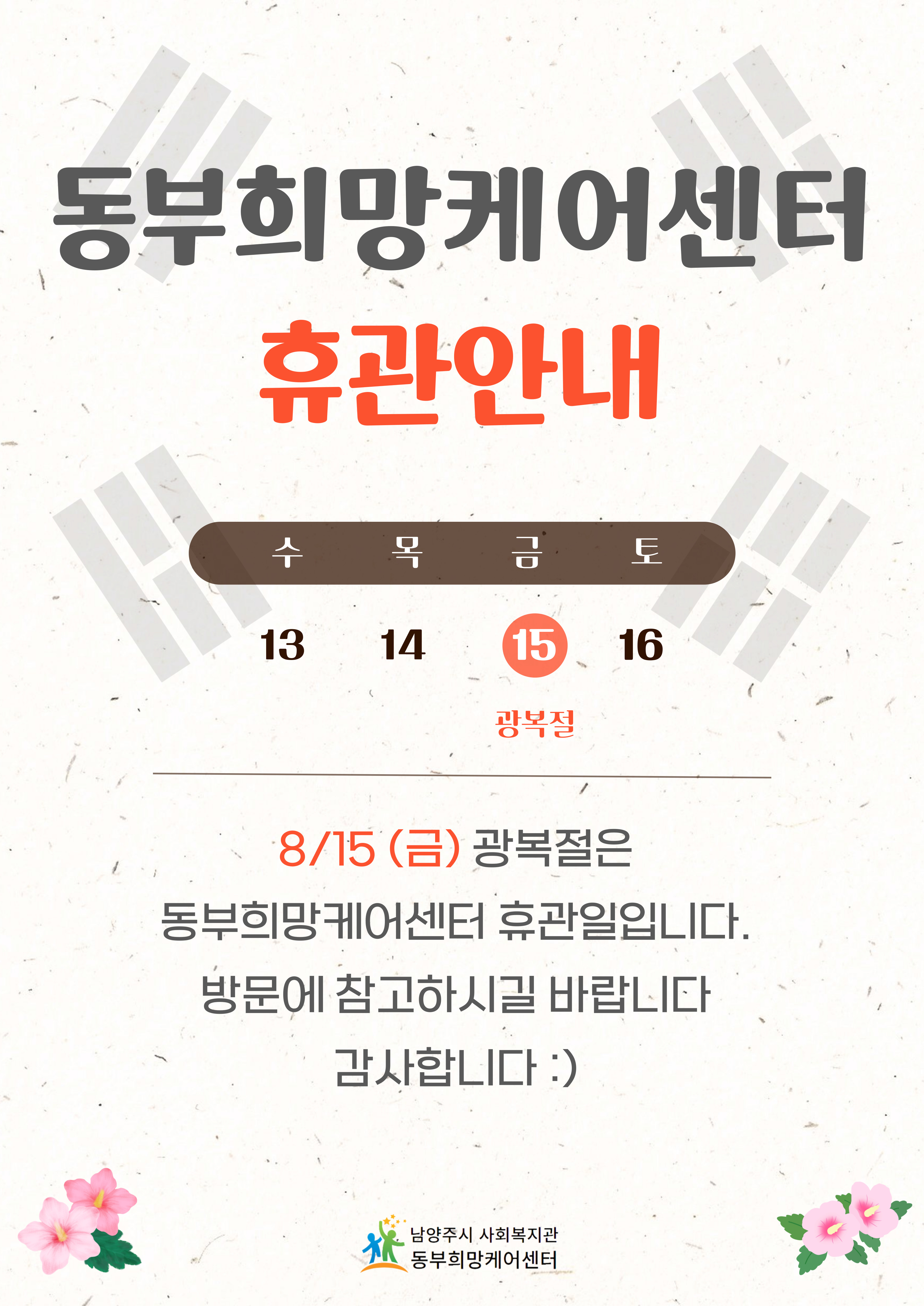 동부희망케어센터 동부희망케어센터 [8월 휴관안내] 등록일자 2025-08-11 조회 60 내용 안녕하세요, 동부희망케어센터입니다.8/15(금) 광복절은 센터 휴관일입니다.방문에 참고부탁드립니다, 감사합니다 :) 첨부파일 2025.8 휴관안내.jpg [ Size : 1.33MB, Down : 42 ] 미리보기 다운로드 목록보기