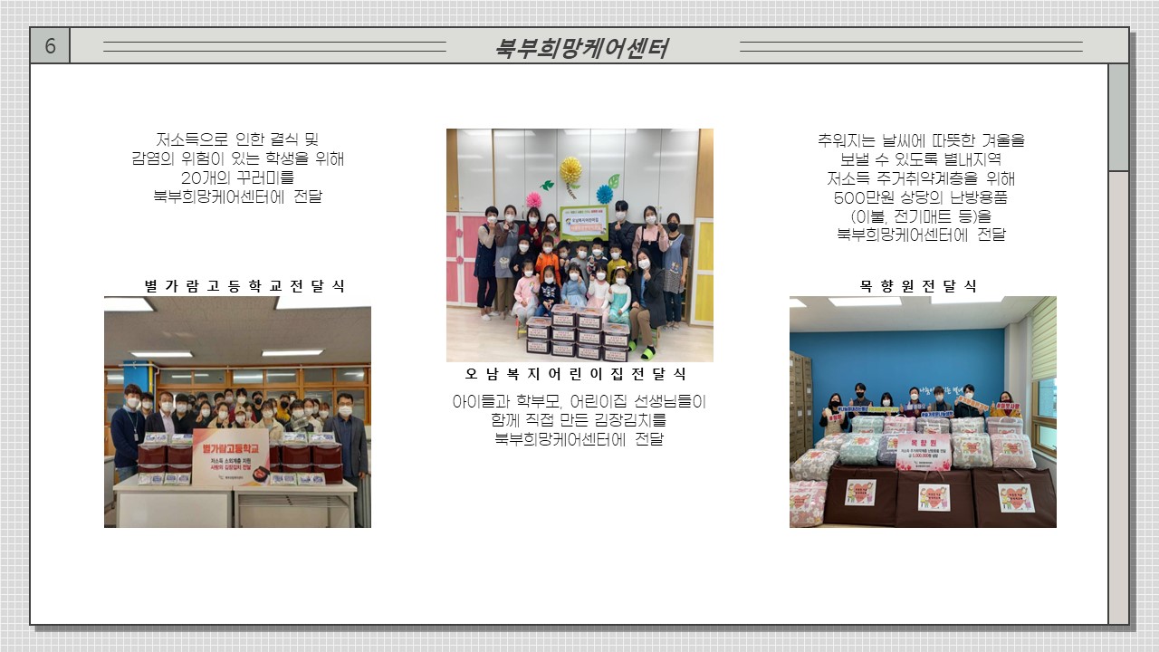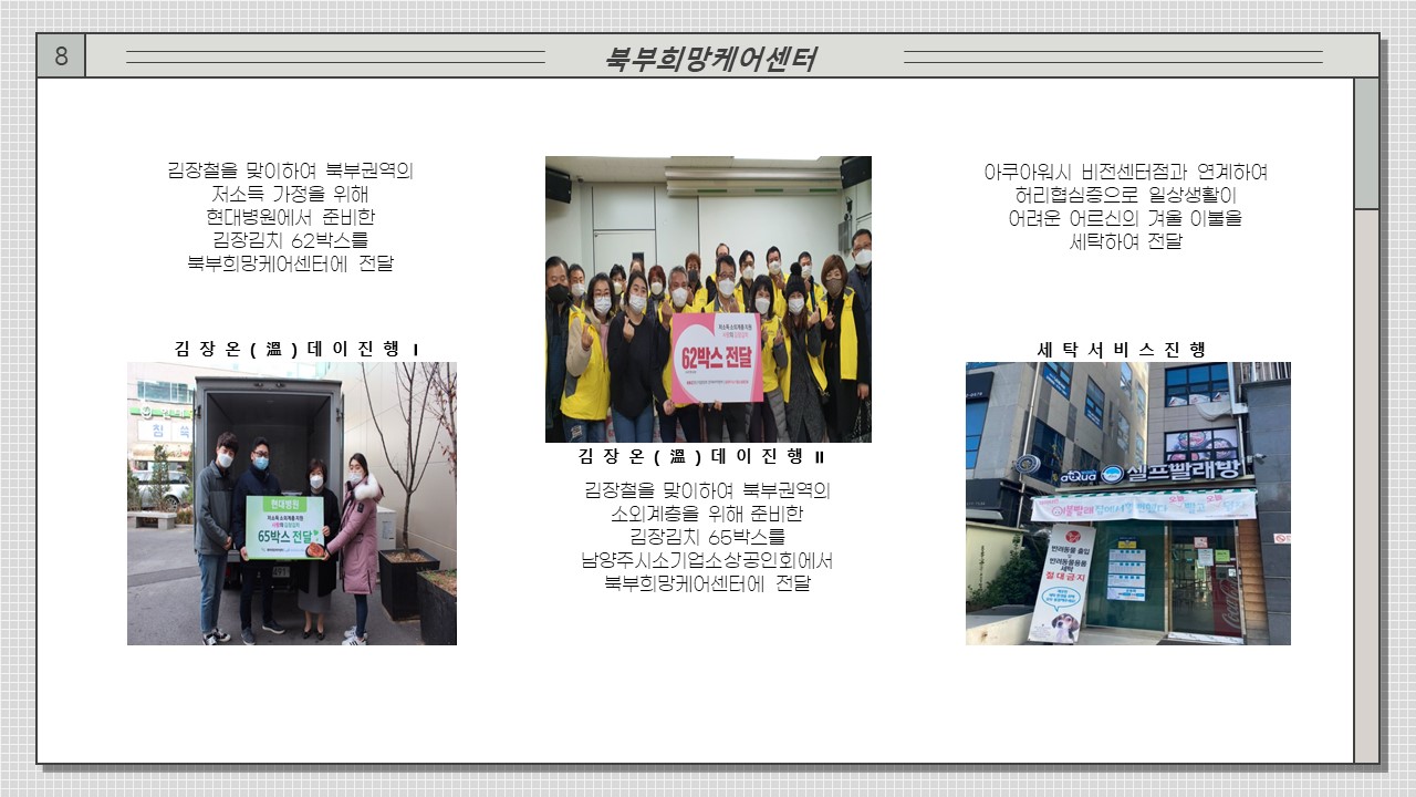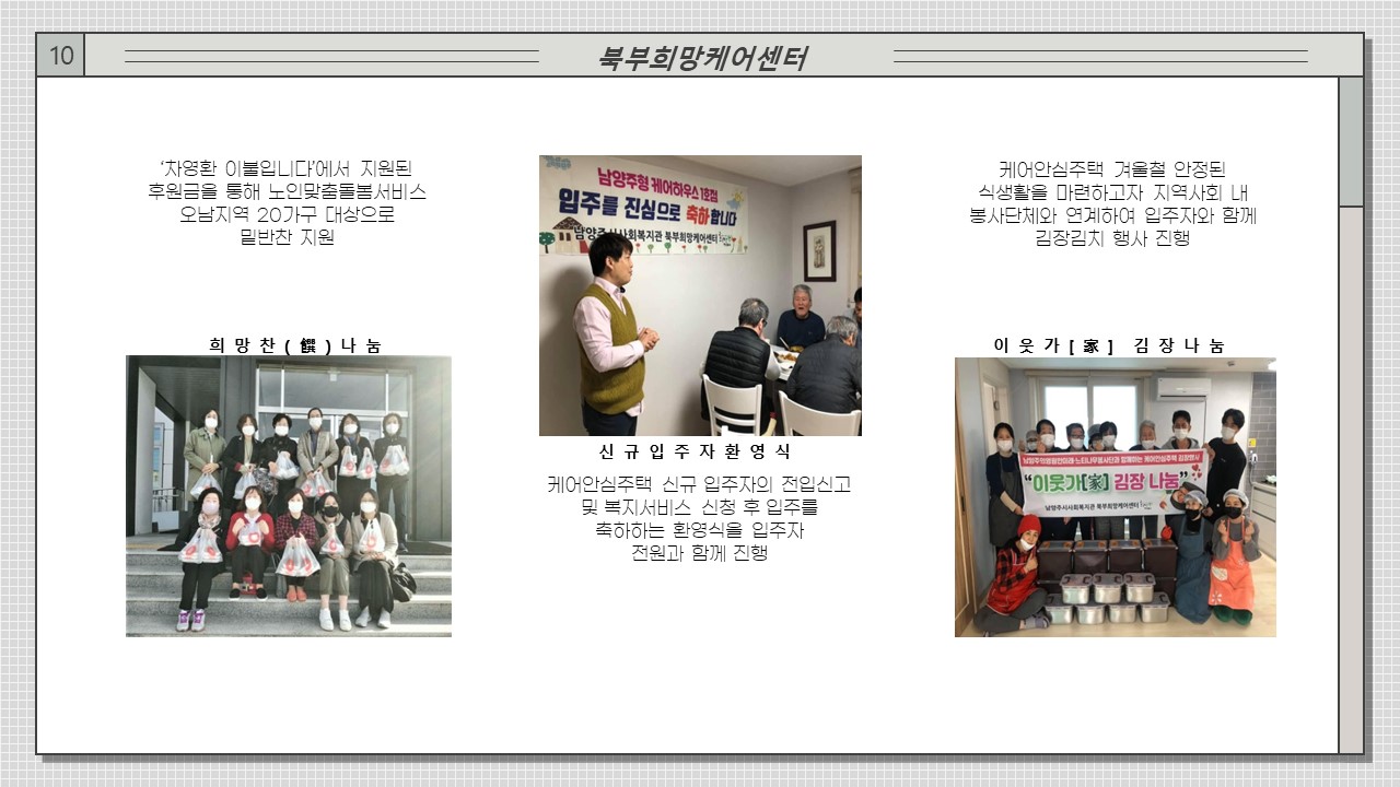 북부희망케어센터는 지난 2020년 11월 지역사회와 다양한 사업을 진행하였습니다. 항상 북부희망케어센터와 지역사회를 위해 나눔을 해주시는 모든 분께 감사드립니다. 자세한 내용은 이미지를 참고해주세요.
