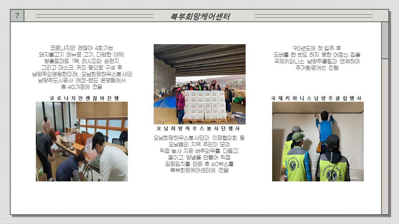 북부희망케어센터는 지난 2020년 11월 지역사회와 다양한 사업을 진행하였습니다. 항상 북부희망케어센터와 지역사회를 위해 나눔을 해주시는 모든 분께 감사드립니다. 자세한 내용은 이미지를 참고해주세요.