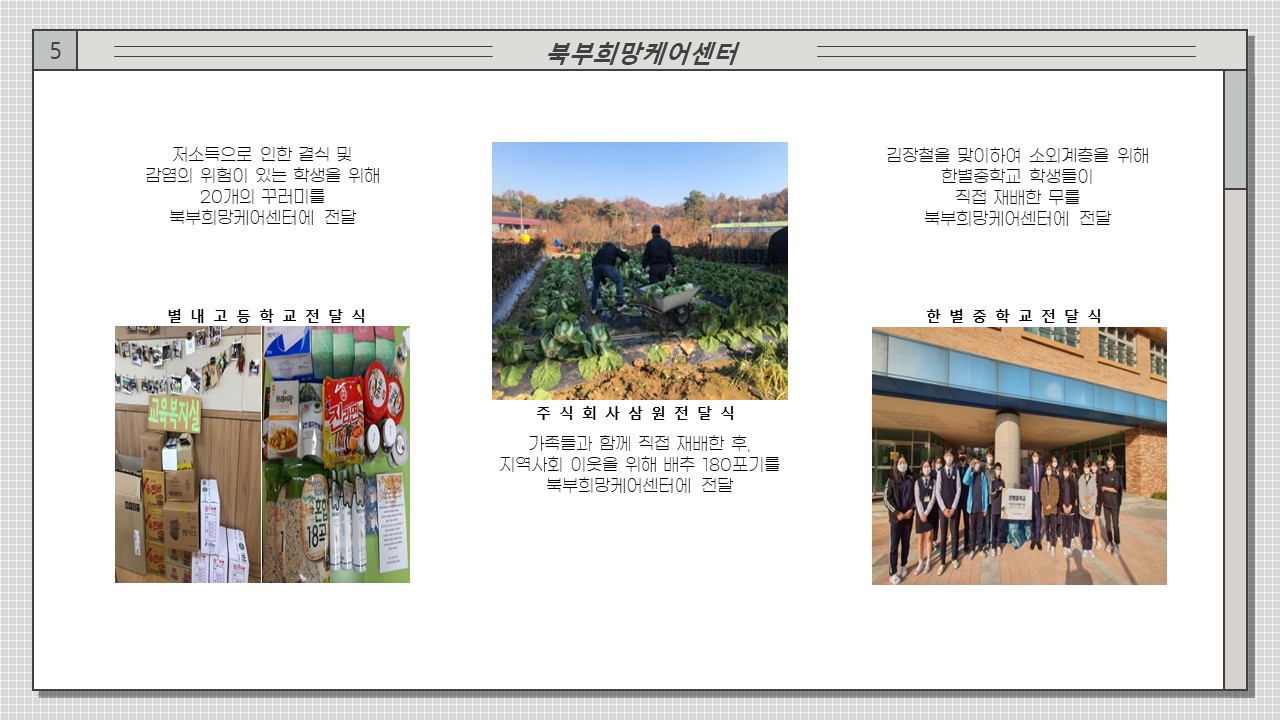 북부희망케어센터는 지난 2020년 11월 지역사회와 다양한 사업을 진행하였습니다. 항상 북부희망케어센터와 지역사회를 위해 나눔을 해주시는 모든 분께 감사드립니다. 자세한 내용은 이미지를 참고해주세요.