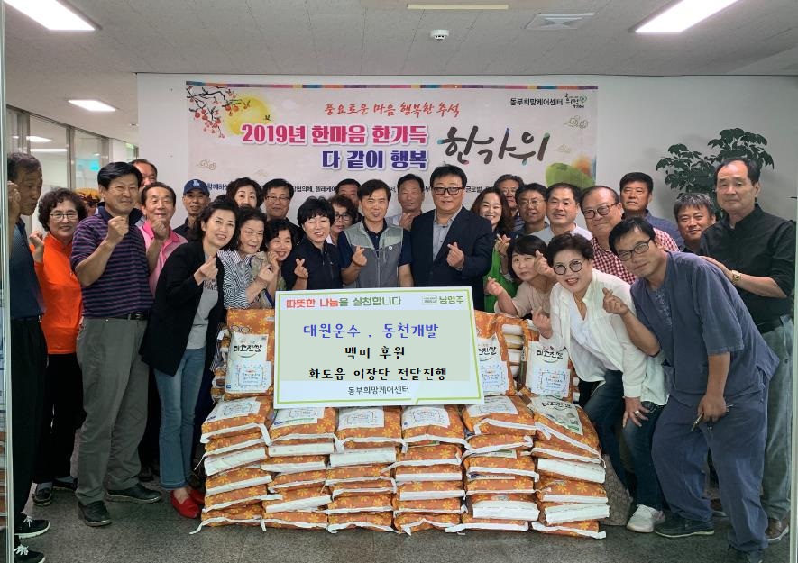 시민의 힘으로 시민을 돕습니다. 추석은 멀리 떨어져 살던 가족들이 오랜만에 모여 이야기도 나누고 선물도 주고받는 민족 고유의 명절입니다. 하지만 이런 추석에 홀로 어렵게 지내시는 분들도 많습니다. 오늘은 이러한 분들을 위해 마음이 따뜻한 사람들이 또 한 번 뭉쳤습니다. 대원운수와 동천개발에서 어려운 이웃에게 전달해 달라며 백미를 후원해 주셨고 화도읍 이장단에서는 마을의 소외된 이웃을 추천, 직접 쌀을 전달해 주셨습니다. 마음이 따뜻해지는 오늘 행사에는 화도·수동행정복지센터 이군희 센터장님도 함께 참석해주셨습니다. 따뜻한 마음이 모여 필요한 이웃에게 돌아가고 마을사람들이 한마음 한뜻으로 도운 오늘. 오늘도 동부희망케어센터는 따뜻합니다.