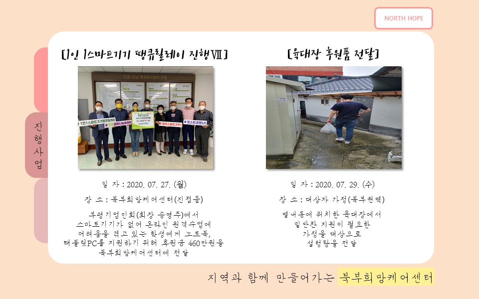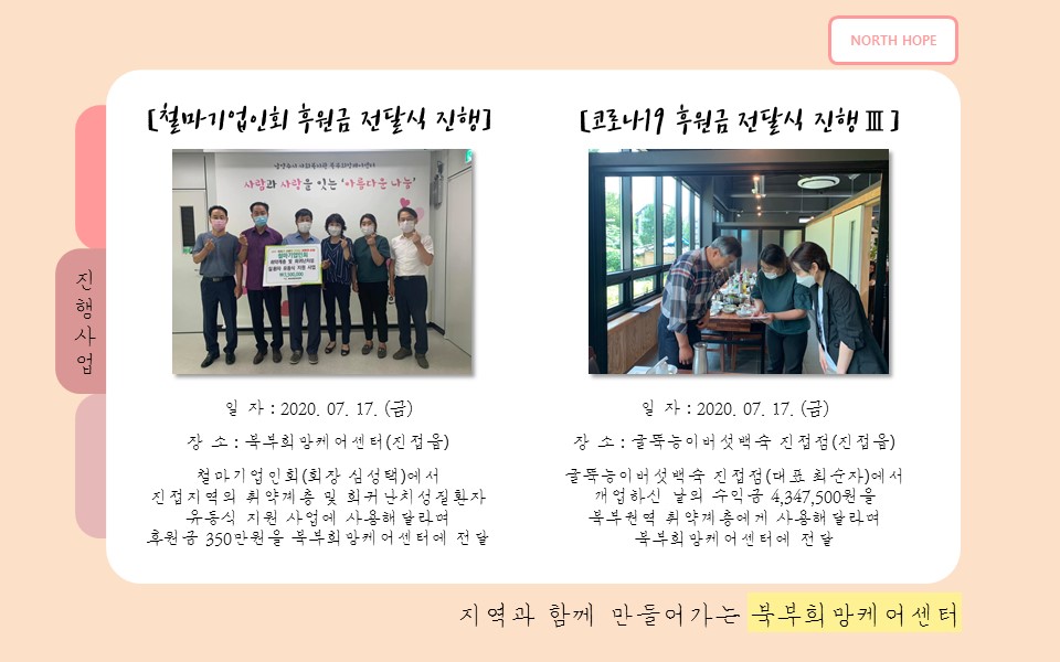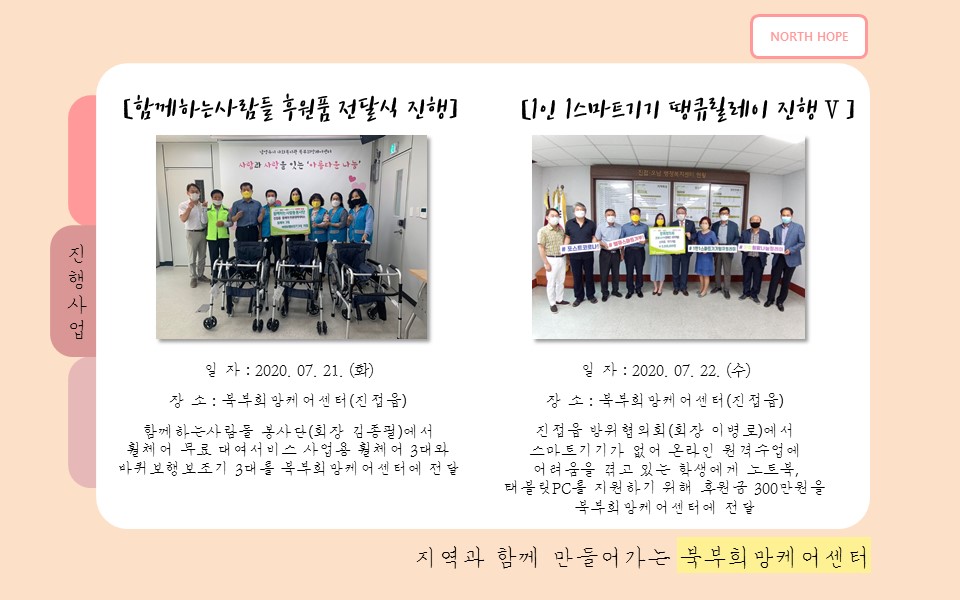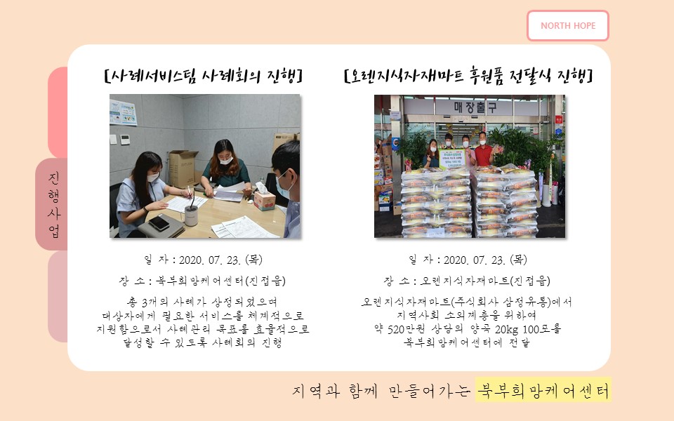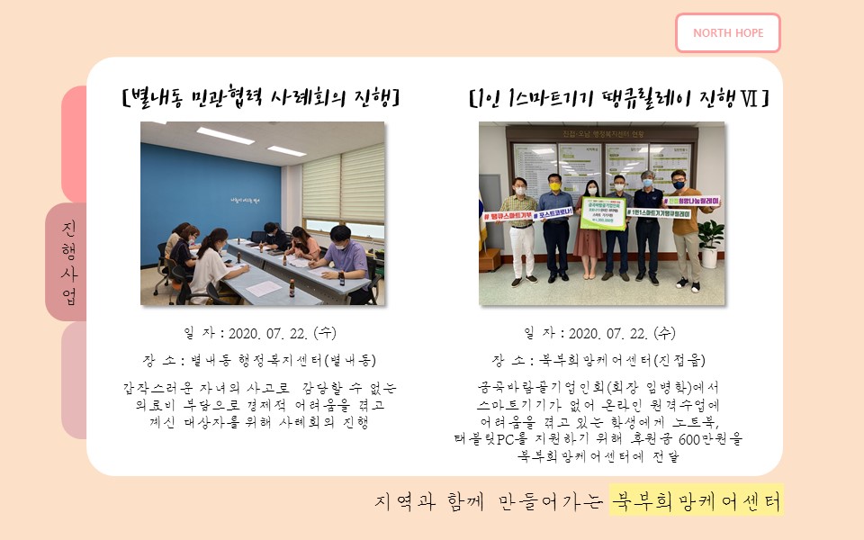 북부희망케어센터는 지난 2020년 7월 지역사회와 다양한 사업을 진행하였습니다. 항상 북부희망케어센터와 지역사회를 위해 나눔을 해주시는 모든 분께 감사드립니다. 자세한 내용은 이미지를 참고해주세요.