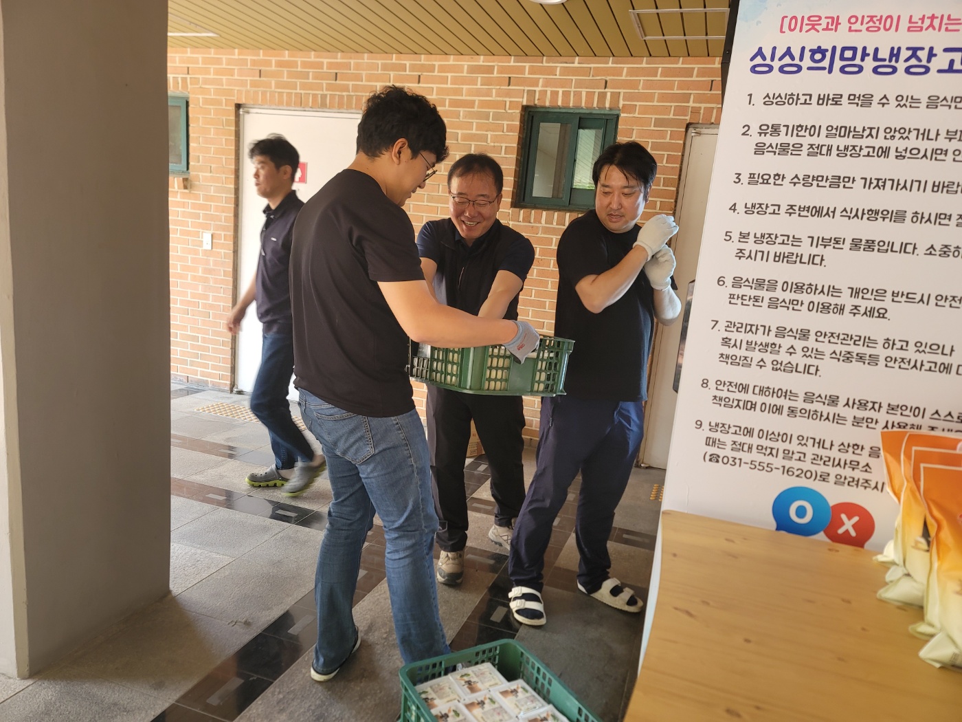 다양한 자원을 동원하여 싱싱희망냉장고에 애정을 쏟으시는 다산2동 지역사회보장협의체와 김민수 위원장님, 가운1단지 관리사무소 위정욱 소장님 등