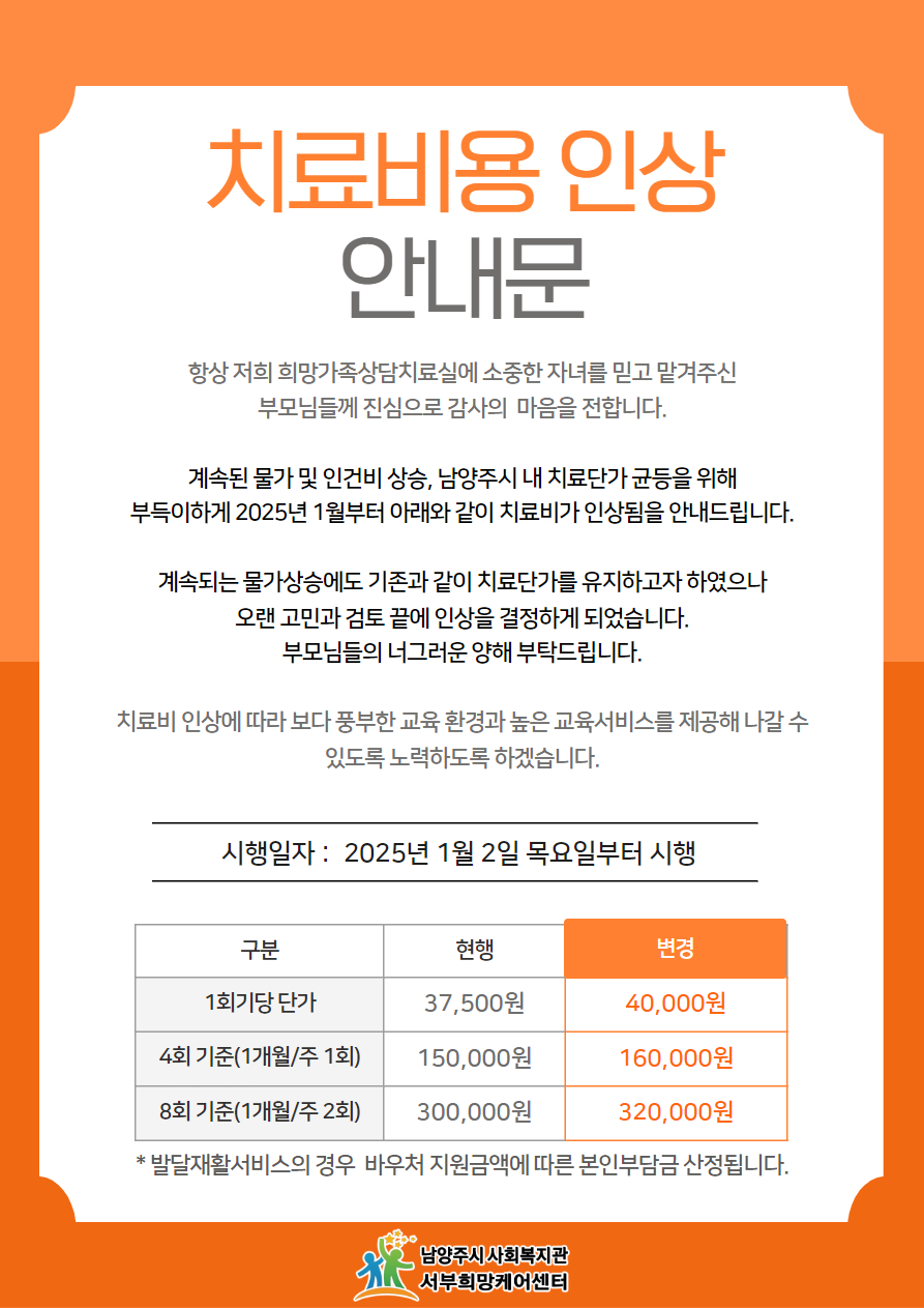 서부희망케어센터 희망가족상담치료실 치료비용 인상 안내문 등록일자 2024-12-11 조회 191 내용 첨부파일 241211 희망가족상담치료실 치료비용 인상 안내문.jpg [ Size : 532.42KB, Down : 52 ] 미리보기 다운로드 목록보기