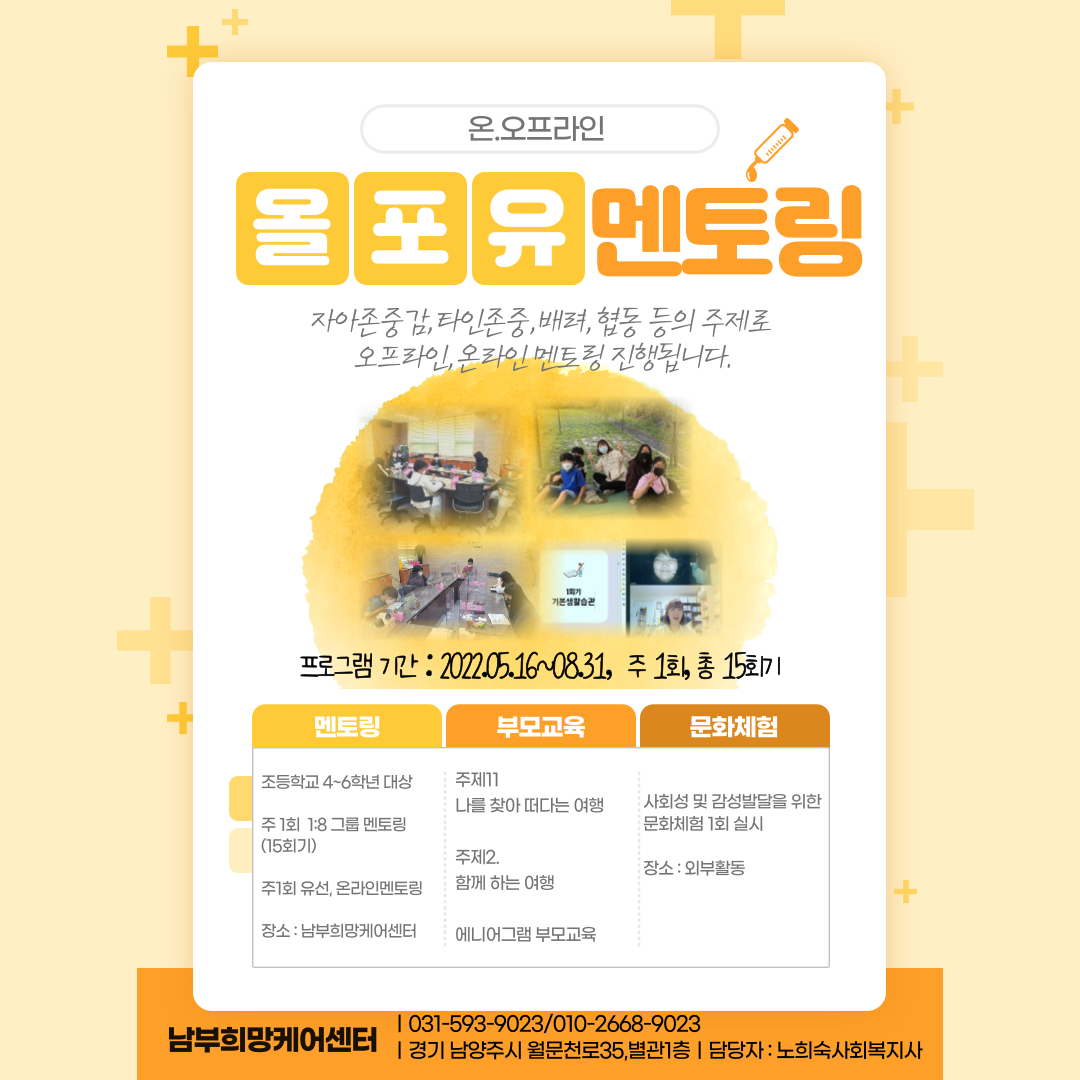 우리 센터에서는 5월부터 8월까지 총 15회기에 걸쳐 취약계층 아동, 청소년의 정서적 안정 및 자아존중감 향상을 위한“올포유 멘토링”을 운영합니다!