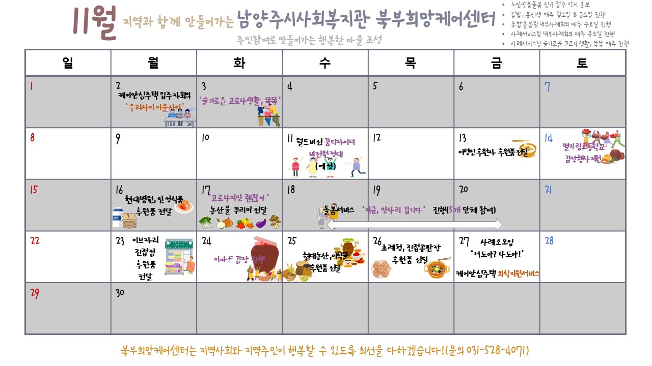 북부희망케어센터에서는 [북부희망케어센터 캘린더]를 통해 센터에서 진행하고 있는 사업 및 전달식을 공유하고자 합니다. 항상 북부희망케어센터와 지역사회를 위해 나눔을 해주시는 모든 분께 감사드립니다. 자세한 내용은 이미지를 참고해주세요. * 11월 진행 사업은 코로나19 확산 속도에 따라 변동될 수 있음을 알려드립니다.