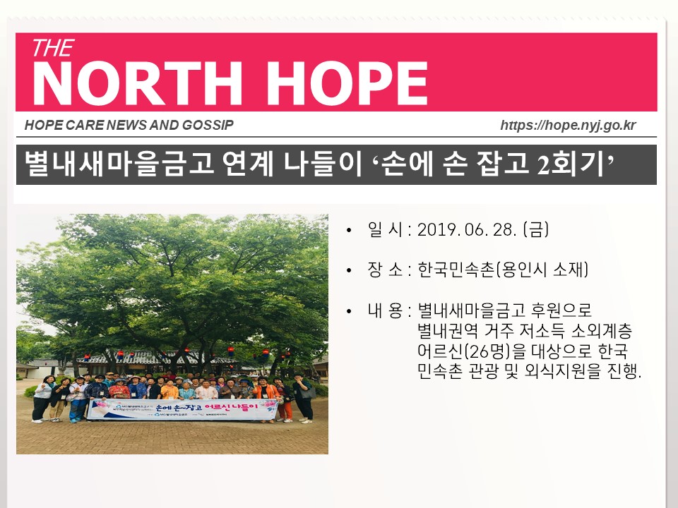 북부희망케어센터는 지난 2019년 6월 지역사회와 다양한 사업을 진행하였습니다. 항상 북부희망케어센터와 지역사회를 위해 나눔을 해주시는 모든 분께 감사드립니다. 자세한 내용은 이미지를 참고해주세요.