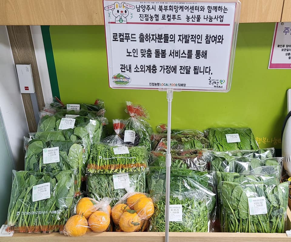 진접농협 하나로마트사업소 로컬푸드(소장 현진호)에서는 경제적인 어려움으로 식생활에 곤란을 겪고 계신 어르신들을 위해 신선한 유기농 야채를 지원하게 되었습니다. 로컬푸드 소장님께서는 어려운 이웃을 위해 함께할 수 있어 기쁘며, 로컬푸드 생산자분들이 관심을 가지고 적극적으로 참여해주신 덕분에 나눔이 진행될 수 있었다 생산자분들께 감사의 말씀을 전하기도 하셨습니다. 지원받은 야채는 노인맞춤돌봄서비스 대상 어르신들께 생활지원사 선생님을 통해 직접 또는 비대면으로 전달 될 예정입니다. 지역의 어려운 분들을 위해 나눔 해주시는 로컬푸드 관계자분들께 진심으로 감사드립니다.