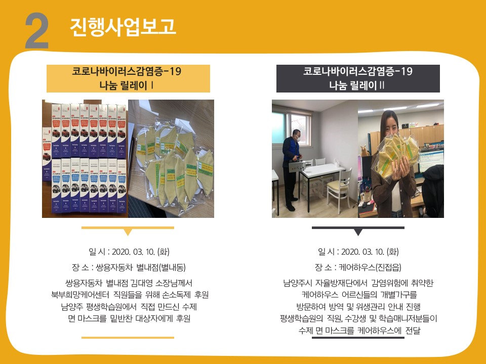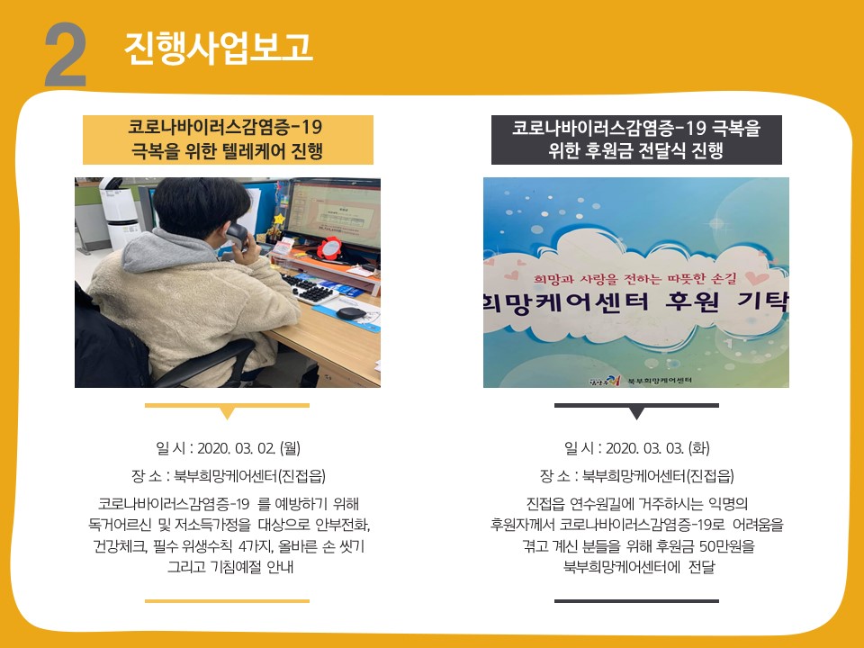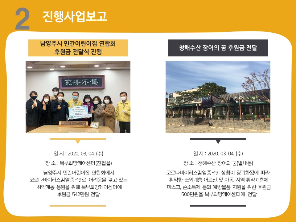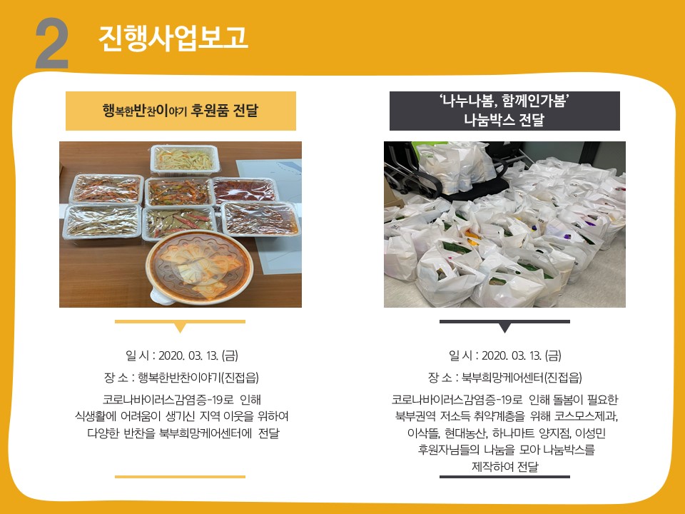 북부희망케어센터는 지난 2020년 3월 지역사회와 다양한 사업을 진행하였습니다. 항상 북부희망케어센터와 지역사회를 위해 나눔을 해주시는 모든 분께 감사드립니다. 자세한 내용은 이미지를 참고해주세요.
