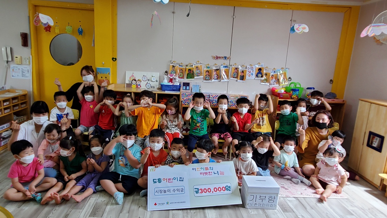 7월 6일(화) 수동면에 소재한 도촌어린이집(조연희원장)에서는 지난주 시장놀이 행사가 있었습니다. 원아들이 각자 물품을 준비해 서로 사고파는 시장놀이 프로그램을 통해 원아들에게 경제관념과 나눔의 기쁨을 체험해 주기위해 진행되고 있습니다. 도촌어린이집은 매년 아이들과 함께 아나바다 시장놀이를 진행해 바자회 수익금으로 성금을 마련해 주셨는데 올해 전달된 성금은 남양주시복지재단을 통해 어려운 이웃을 위해 쓰일 예정입니다. 코로나19 장기화로 어린이집 운영에 어려움이 많은 상황에서도 2018년에 이어 올해도 아이들의 따뜻한 손길에 감사드립니다.
