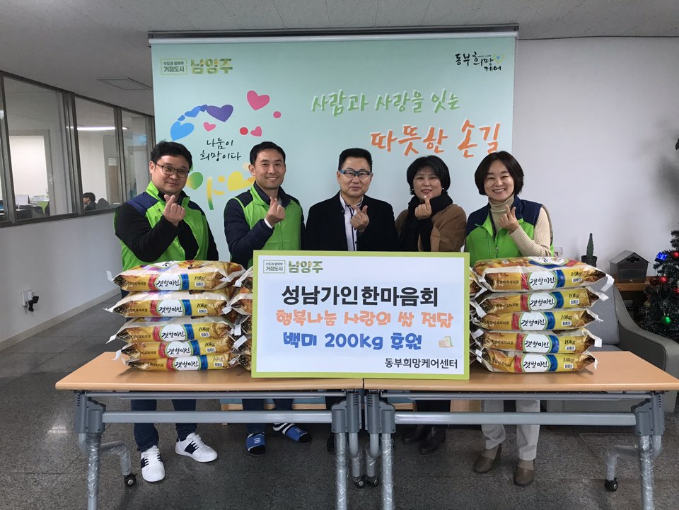 동부희망케어센터(센터장 최정선)에서는 성남시 볼링협회 가인한마음회와 함께 후원물품 전달식을 진행했다. 가인한마음회는 성남시에서 활동 중인 볼링협회로 남양주시지역사회보장협의체 위원으로 활동 중인 회원의 소개로 남양주시에 위치한 동부희망케어센터에 후원물품(백미 200kg)을 후원하게 되었다고 한다. 전달된 후원물품은 지역의 저소득층 가정들에게 전달 될 예정이다.