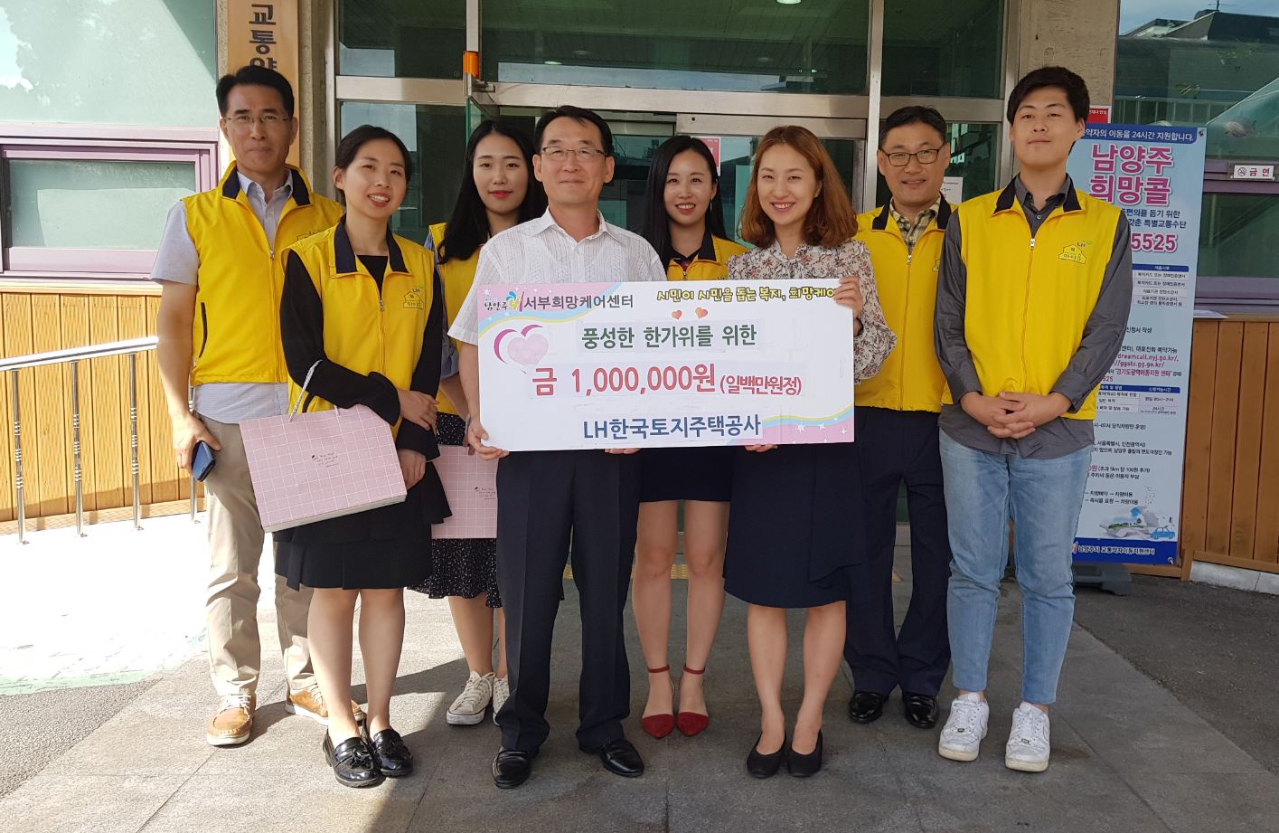 LH 서울지역본부 남양주권주거복지센터 김우현(센터장 김우현)는 지난 13일, 저소득층의 풍성한 한가위를 위해 후원금 100만원을 남양주시 서부희망케어센터(센터장 신영미)에 전달했다.