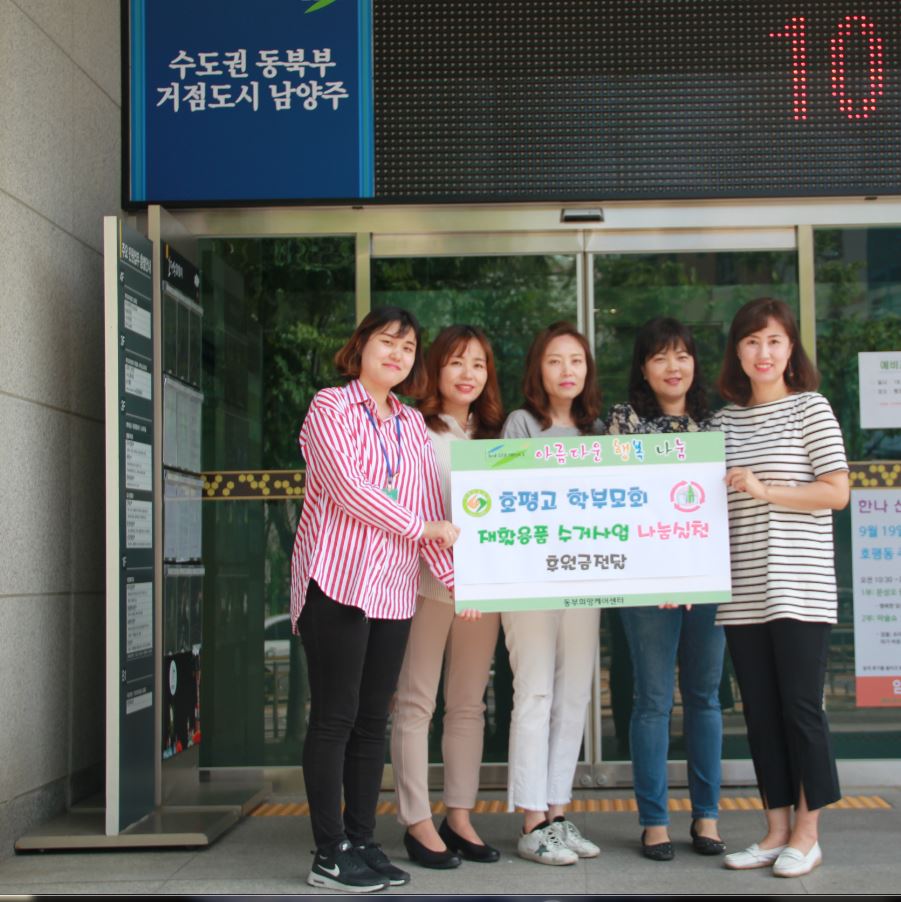 남양주시 호평동 소재 호평고등학교 학부모회 및 학생들은 지난 18일, 함께 진행한 재활용품 수거사업으로 발생된 수익금 113,500원을 남양주시 동부희망케어센터(센터장 최정선)에 전달하였다.