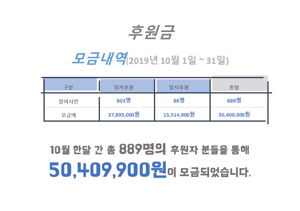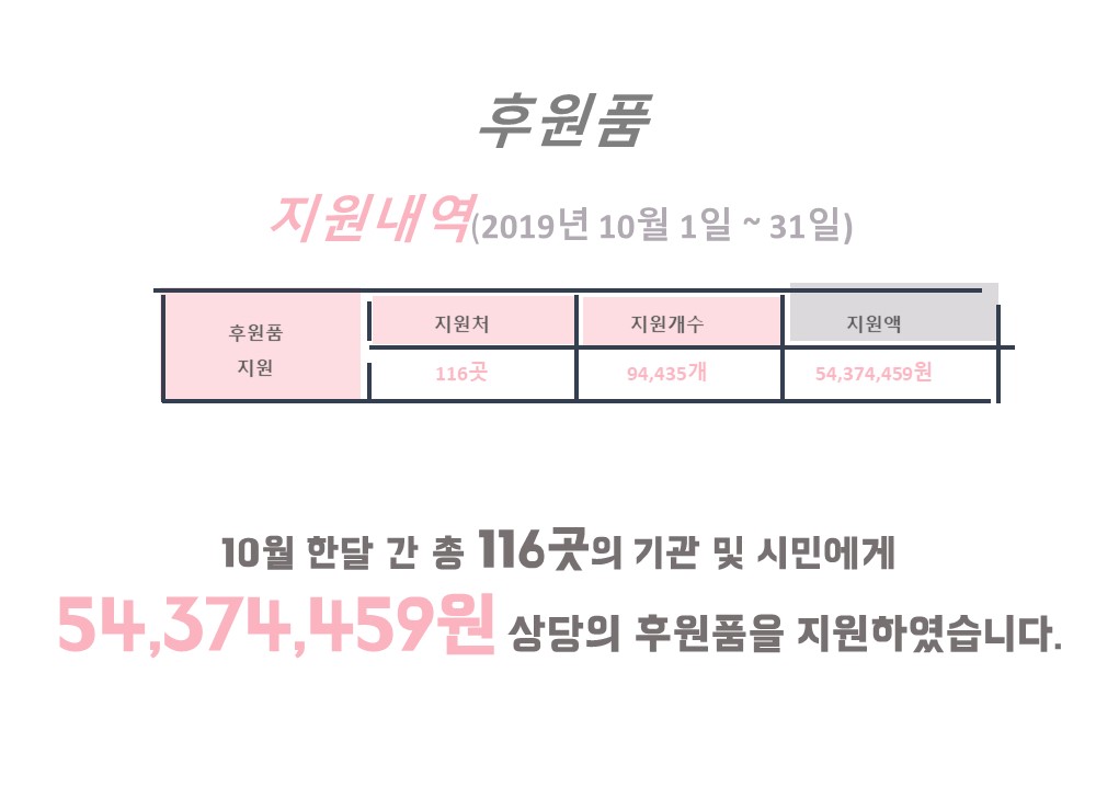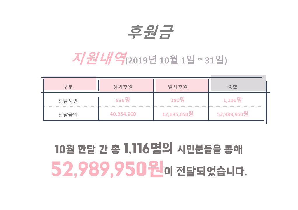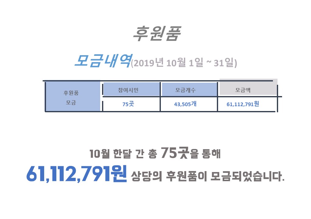 지난 10월 지역주민들이 함께 나누어주셨던 따뜻한 나눔현황을 보여드리고자합니다. 10월 한달 간 803명의 시민분들이 50,409,900원의 후원금을, 75곳의 시민분들이 61,112,791원 상당의 후원품을 나누어주셨습니다. 항상 북부희망케어센터와 지역사회를 위해 나눔을 해주시는 모든 분께 감사드립니다. 자세한 내용은 이미지를 참고해주세요.