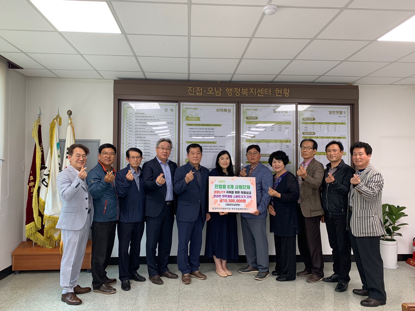 진접읍 8개 사회단체(회장 김대식)가 코로나19 극복을 위해 모은 성금 10,500,000원을 북부희망케어센터에 전달했다. 진접읍 8개 사회단체의 후원으로 '전 시민 서로 버팀목 되어주기' 캠페인을 전개하고 있으며, 회원들이 솔선수범하여 시민의 자발적 기부를 위한 다양한 홍보활동을 펼치고 있다. 김대식 회장은 "모두가 어려운 시기이지만 좋은 일에 뜻을 함꼐 해주신 회원들에게 감사하다. 늘 한마음으로 함께 가는 진접읍 지역공동체의 모습을 이어가겠다."며 기부소감을 밝혔다. 진접읍 8개 사회단체는 지난 3월에도 코로나19 감염병에 취약한 어려운 이웃을 위한 건강 맞춤 선물꾸러미 지우너 사업에 600만원 상당의 식료품 등을 300가구에 전달한 바 있다.