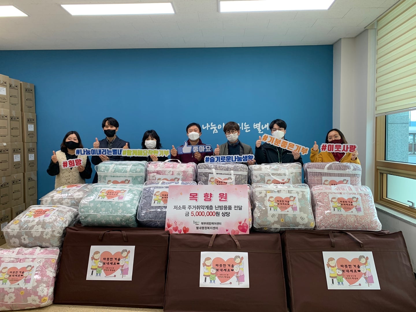 북부희망케어센터에서는 목향원과 함께 전달식을 진행하였다. 추워지는 날씨에 따뜻한 겨울을 보낼 수 있도록 목향원 한성우 대표님께서 별내지역 저소득 주거 취약계층을 위해 500만원 상당의 난방용품(이불, 전기매트 등)을 북부희망케어센터에 전달해주었다. 목향원 대표님은 항상 지역의 어려운 이웃을 위해 따뜻한 나눔을 해주고 계신다. 그동안 기회가 있을 때마다 지역의 어르신, 청소년에게 도움이 되고자 나눔을 했는데 올해는 코로나로 인해 나들이가 어려워 어떻게 해야 큰 도움이 될까 고민하시다 난방용품을 지원하시게 되었다고 한다. * 코로나 단계 격상 전 진행한 사업임을 알려드립니다.