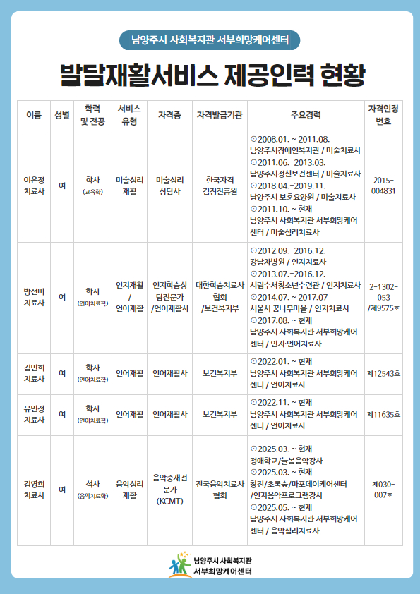 서부희망케어센터 「공시」 2025년 희망가족상담치료실 발달재활서비스 제공인력 현황 공고(2025.06. 기준) 등록일자 2025-06-24 조회 124 내용 안녕하세요. 남양주시 사회복지관 서부희망케어센터입니다.우리 복지관은 장애아동가족지원사업 발달재활서비스 제공기관으로서,희망가족상담치료실 발달재활서비스 제공인력 현황을 공고하오니 참고하시기 바랍니다. 감사합니다. 첨부파일 2025.06..jpg [ Size : 359.52KB, Down : 58 ] 미리보기 다운로드 목록보기