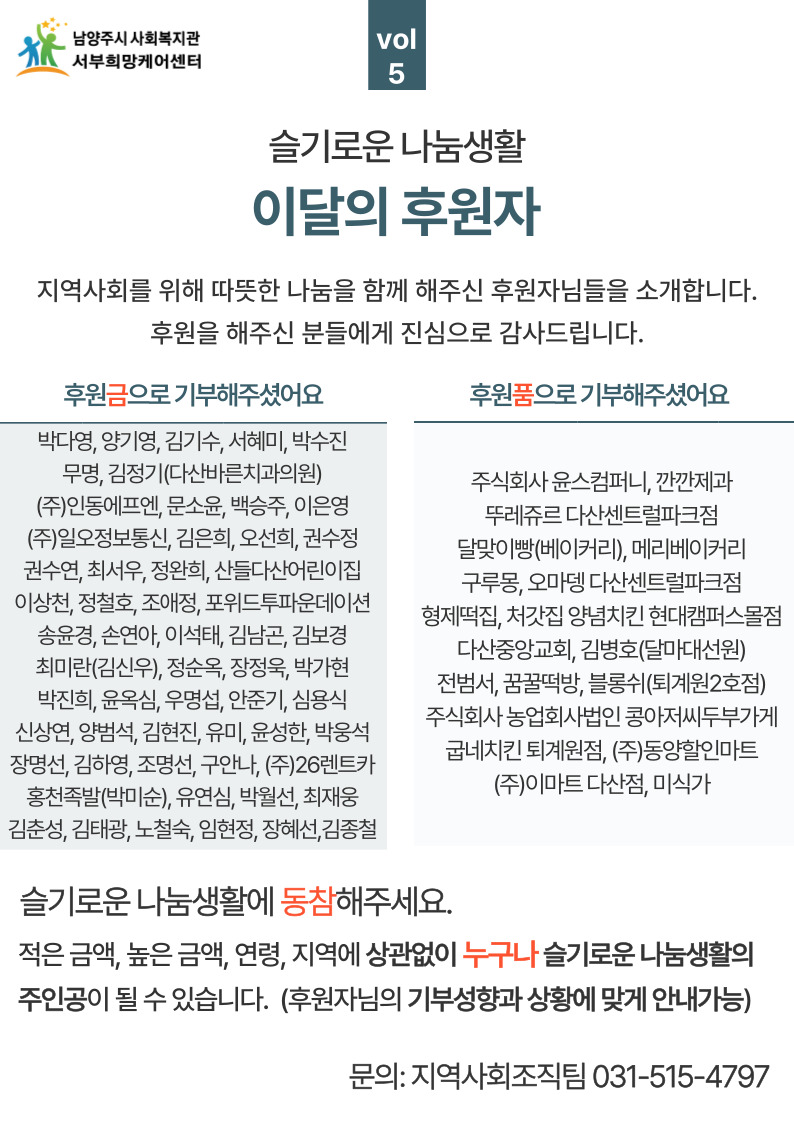 서부희망케어센터 슬기로운 나눔생활, 이달의 후원자_5월