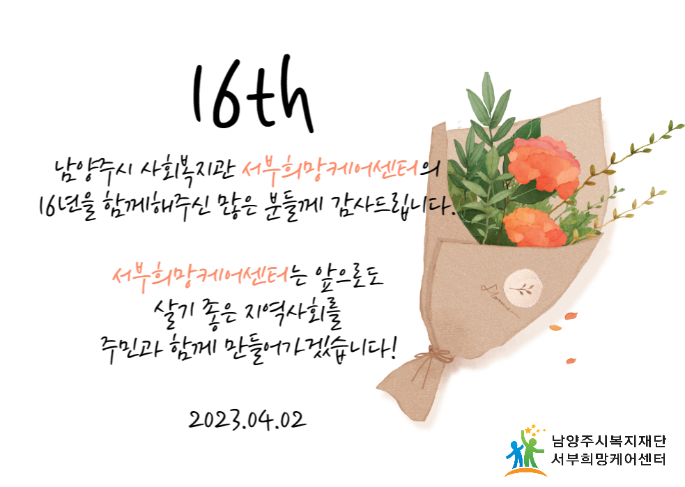 서부희망케어센터 서부희망케어센터 / 개관 16주년을 맞아 감사드립니다. 등록일자 2023-03-30 조회 222 내용 서부희망케어센터가 개관 16주년을 맞이하였습니다. 앞으로도 지역주민과 함께하는 서부희망케어센터가 되겠습니다. 첨부파일 16주년.jpg [ Size : 278.58KB, Down : 66 ] 미리보기 다운로드 목록보기