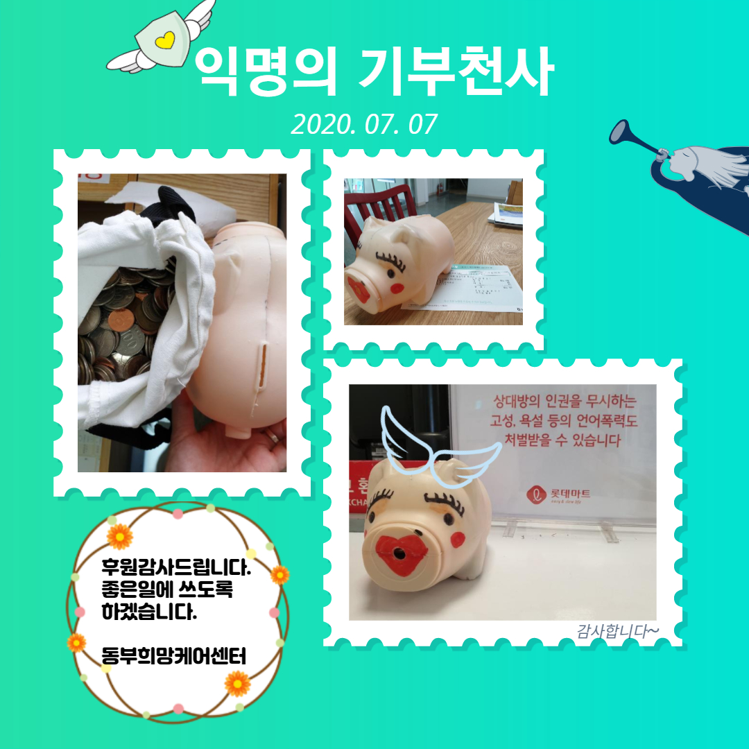 동부희망케어센터 동부희망케어센터, 익명의 기부천사가 나타나다. 등록일자 2020-07-13 조회 260 내용 7월 7일 롯데마트 마석점에 익명의 후원자가 저금통을 기부해 주셨습니다. 롯데마트 마석점에서는 저금통을 동부희망케어센터에 기탁해 주셨습니다. 불우한 이웃에게 사용해달라는 말과 함께 돼지 저금통을 전달해 주셨습니다. 전달해 주신 후원금은 현재 센터에서 진행하고 있는 프로그램에 사용될 예정입니다. 후원 감사합니다. 첨부파일 롯데마트 익명.jpg [ Size : 616.11KB, Down : 66 ] 미리보기 다운로드 목록보기
