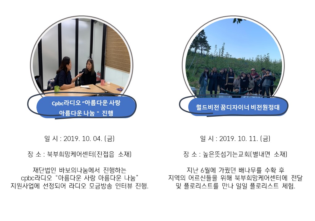 북부희망케어센터는 지난 10월 지역사회와 다양한 사업을 진행하였습니다. 항상 북부희망케어센터와 지역사회를 위해 나눔을 해주시는 모든 분께 감사드립니다. 자세한 내용은 이미지를 참고해주세요.