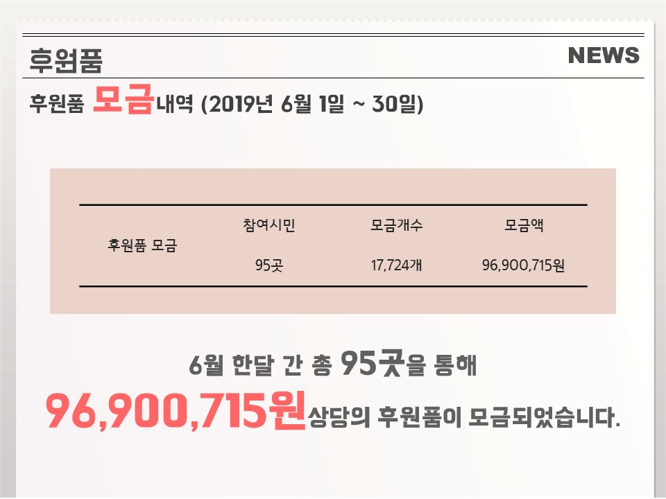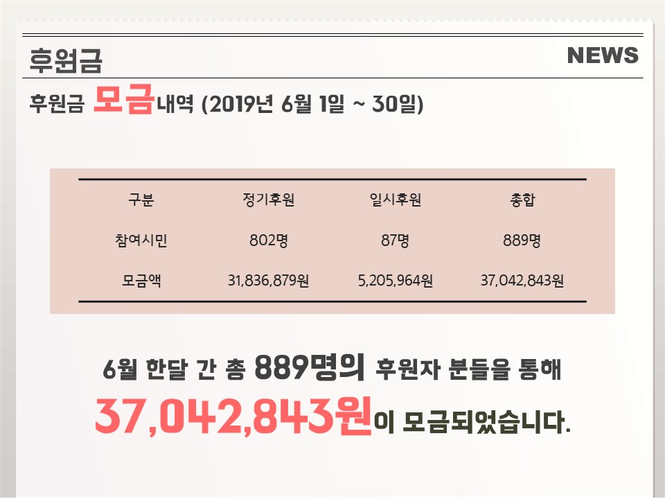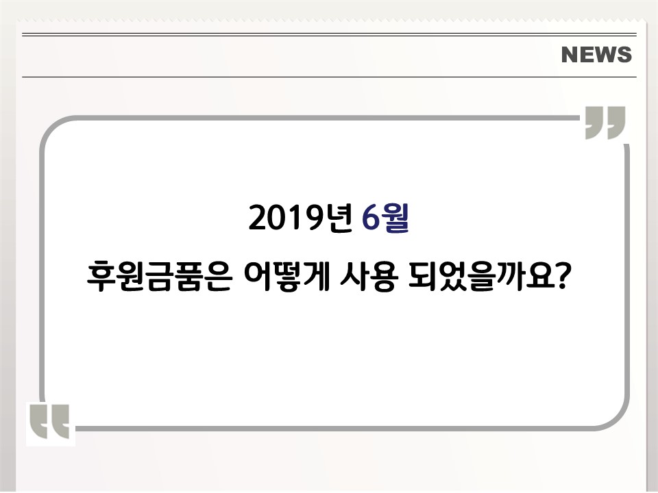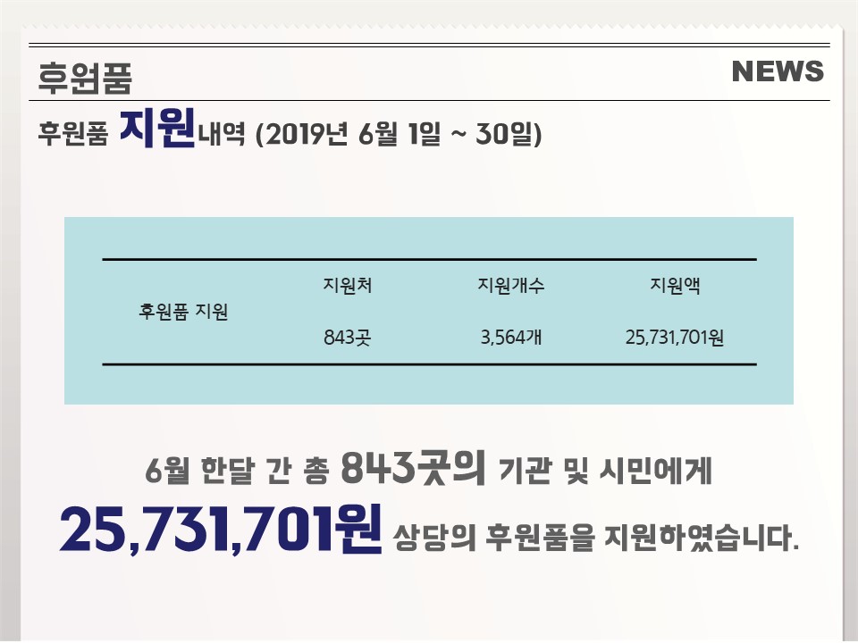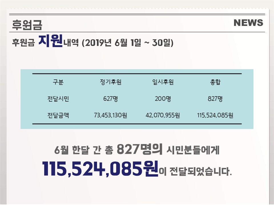 지난 2019년 6월 지역주민들이 함께 나누어주셨던 따뜻한 나눔현황을 보여드리고자합니다. 6월 한달 간 889명의 시민분들이 37,042,843원의 후원금을, 95곳의 시민분들이 96,900,715원 상당의 후원품을 나누어주셨습니다. 항상 북부희망케어센터와 지역사회를 위해 나눔을 해주시는 모든 분께 감사드립니다. 자세한 내용은 이미지를 참고해주세요.