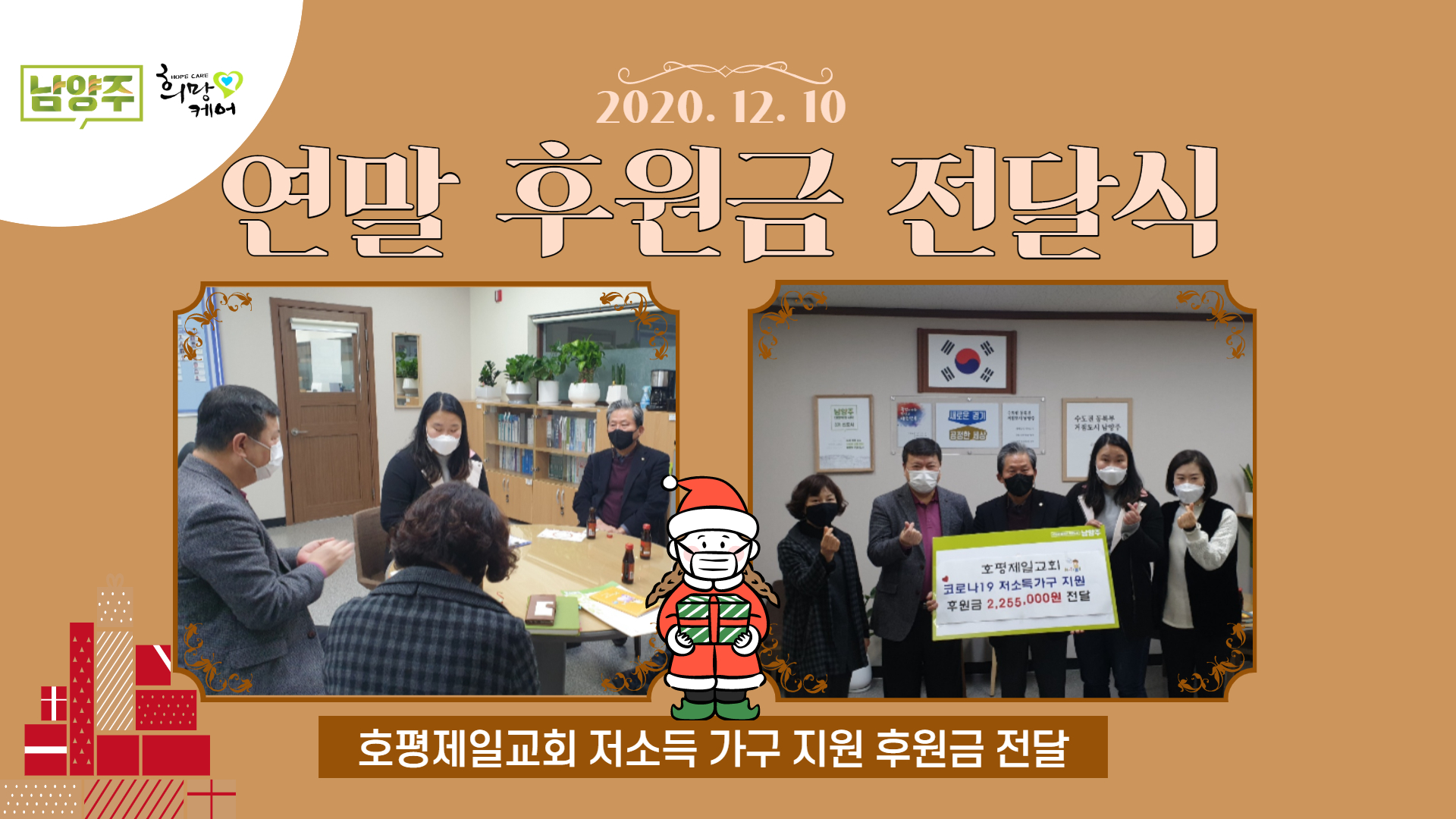 12월 10일(목)에 호평동주민센터에서 진행한 후원금 전달식에 2,555,000원을 후원해주셨습니다. 이 후원금은 교회의 모금액을 십시일반 모아 후원금으로 기부를 해주시기 위해 노력하셨고, 성도들의 마음을 모아 함께 전달해주셨습니다. 후원금은 코로나19의 저소득가구에 지원하기 위해 공동모금회로 지정기탁해주셨습니다. 후원 감사합니다~!