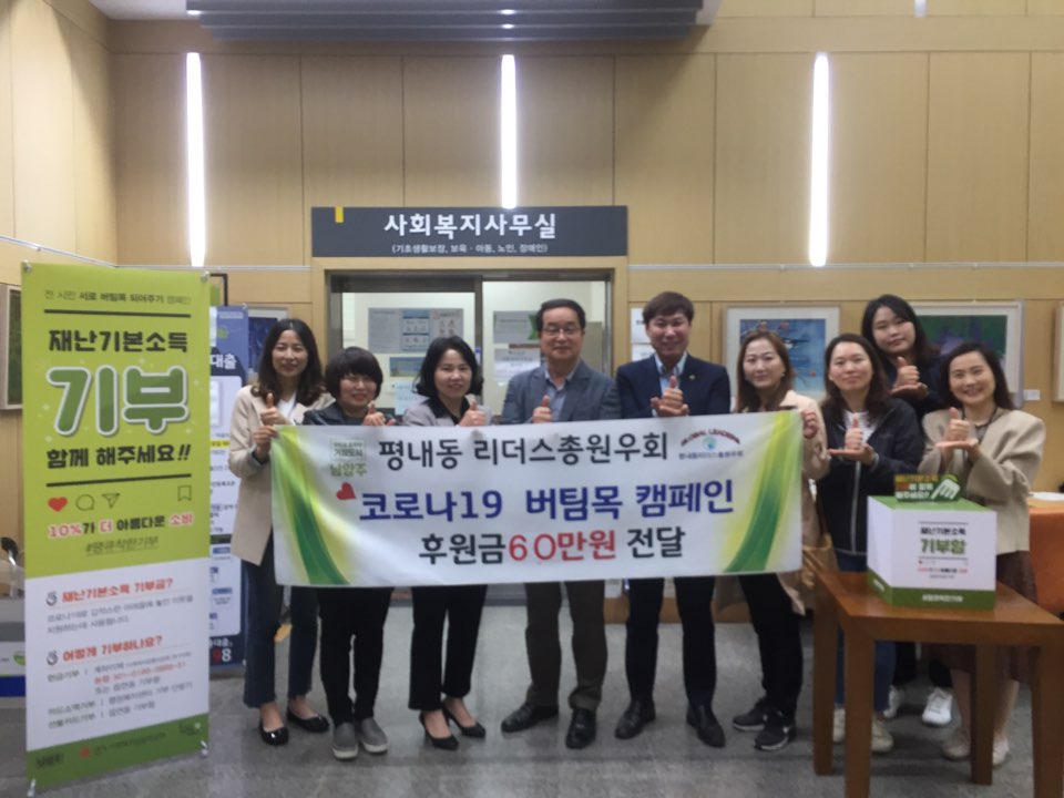 동부희망케어센터 동부희망케어센터, 평내동 리더스 원우회에서 후원금 전달 등록일자 2020-05-19 조회 259 내용 평내동 리더스 원우회(회장 배인성)에서는 코로나19로 어려움을 겪고 있는 취약계층의 위기 극복을 위한‘서로 버팀목 되어주기’캠페인에 적극 참여하기로 뜻을 같이 하고 나눔을 실천했다. 평내동 리더스 원우회 임원들의 솔선수범으로 23명의 회원들이 정성으로 모금한 후원금 60만원을 동부희망케어센터에 지정 기탁했다. 첨부파일 평내.jpg [ Size : 92.19KB, Down : 51 ] 미리보기 다운로드 목록보기