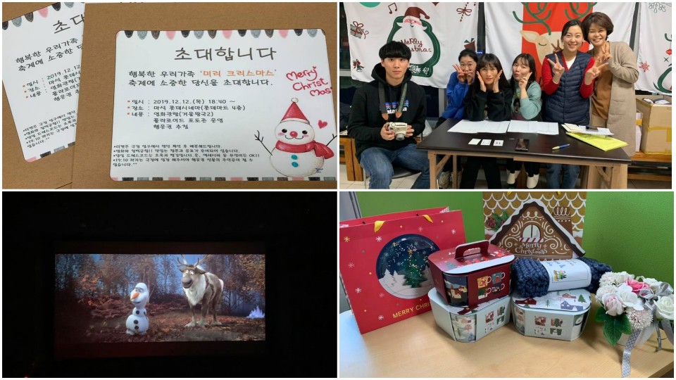 행복한 우리가족 '미리 크리스마스' 축제에 소중한 당신을 초대합니다. 동부희망케어센터는 다가올 크리마스를 맞아 함께했던 소중한 분들을 모시고 크리스마스 소. 확. 행 미리크리스마스 축제를 진행했습니다. 이번축제는 23가정(총 86명)을 초대하였으며, 요즘 가장 핫한 애니메이션 '겨울왕국2'를 관람하였으며, 가족의 사랑하는 마음을 전하는 '가족사진 포토존' 이벤트, 12월 생일을 맞은 아동을 위한 '다함께 생일축하' 등의 이벤트를 진행했습니다. 그외 크리스마스 산타의 선물로 호평고 학부모회에서 직접만든 이쁜 목도리를 선물하였습니다. 2019년을 마감하는 12월 연말, 바쁜 일정 속에서도 축제를 위해 봉사해주신 천마중학교 학부모회와 지역봉사자분들 호평고 학부모회에게 감사드립니다.