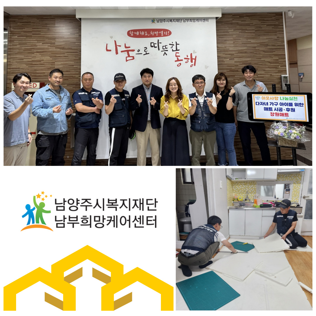 매트 시공 작업 후, 장원매트 이장원, 이재민 대표는“도움이 필요한 사회복지 사각지대 주민들에게 앞으로도 지역에 관심을 가지고 나눔에 동참하겠다. 우리의 도움이 남부희망케어센터에 보탬이 될 수 있어 기쁘다.”라며 의사를 밝혀주셨고, 남부희망케어센터 최정선 센터장은“다자녀 가구 아이의 건강한 성장에 도움을 주신 점 진심으로 감사드린다”라며 “앞으로도 아이가 좋은 영향을 받으며 성장할 수 있도록 열심히 노력하겠다.”라고 전했습니다^^
