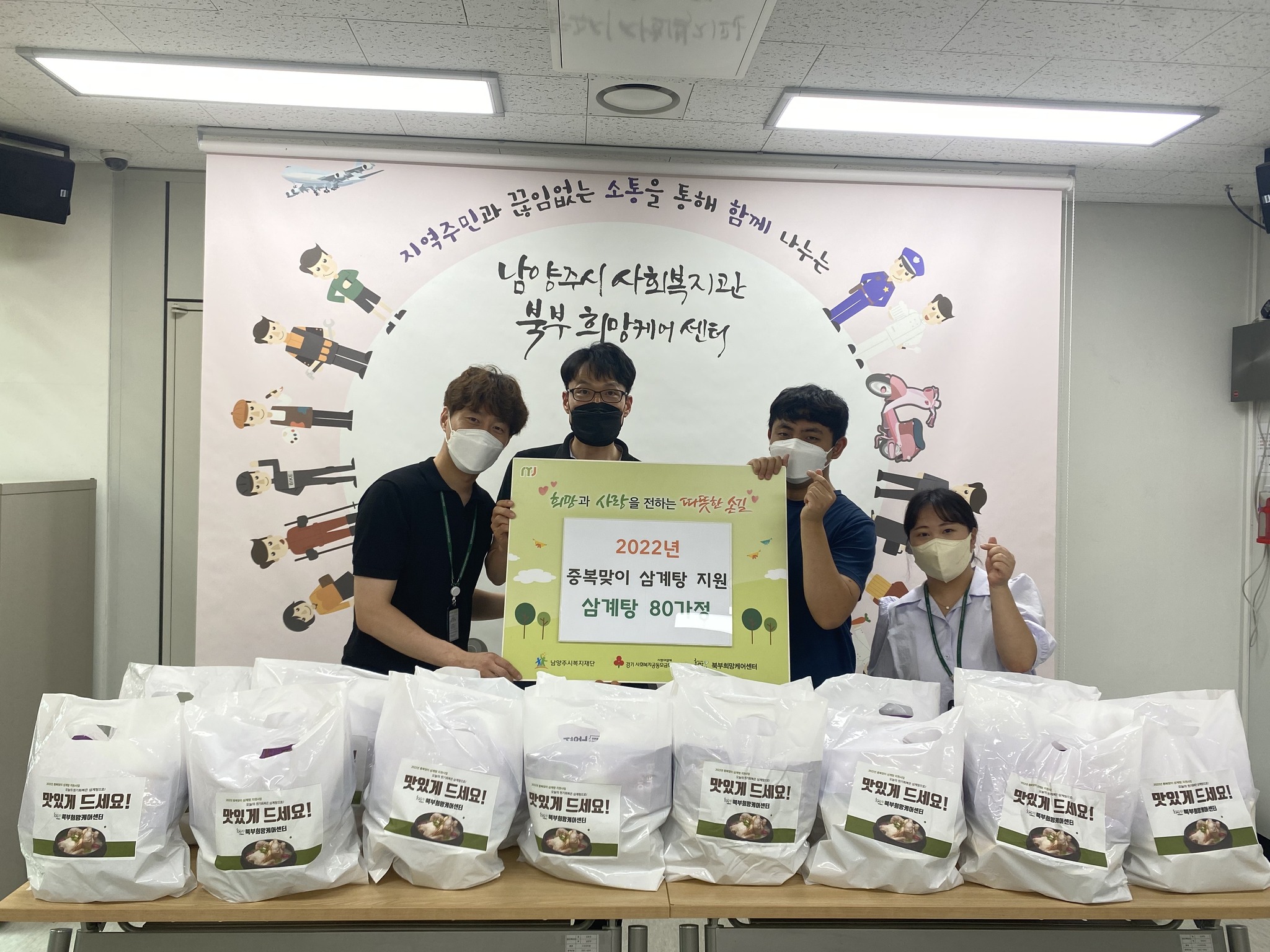 안녕하세요 남양주시사회복지관 북부희망케어센터(센터장 전정수)입니다. 7월 27일 수요일, 북부희망케어센터에서는 중복을 맞이하여, 지역 내 소외된 이웃 80가구를 대상으로 삼계탕 지원사업 "내생애 아름다운 '복' 날"을 진행했습니다. 무더워진 날씨와 높아진 기온 속에서 기운을 회복하고 건강하게 여름을 보낼 수 있도록 삼계탕과 김치, 마스크가 담긴 꾸러미를 구성하였고, 특히 사회복지현장실습에 참여하고 있는 예비 사회복지사선생님들의 마음이 담긴 감사카드를 함께 전달하여 이웃들의 여름나기를 응원하였습니다. 삼계탕을 전달 받으신 한 어르신은 "삼계탕과 응원의 말 덕분에 든든하게 하루를 보낼 수 있을 것 같아요. 정말 감사합니다."라고 말씀하셨습니다. 앞으로도 이웃들에게 관심을 가지고 함께 소통하며 성장해나가는 북부희망케어센터를 지켜봐주세요! 감사합니다.