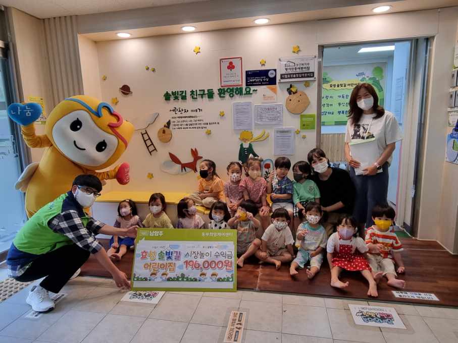 안녕하세요. 동부희망케어센터 입니다. 오늘은 화도읍에 위치한 ‘효성솔빛길 어린이집’에서 시장 놀이 후 수익금 196,000원을 기부하였습니다. ‘효성솔빛길 어린이집’은 매년 시장 놀이의 수익금을 기부해주고 계시는데요, 꾸준한 이웃 나눔을 실천해주고 있는 솔빛길 친구들에게 감사함을 전합니다.