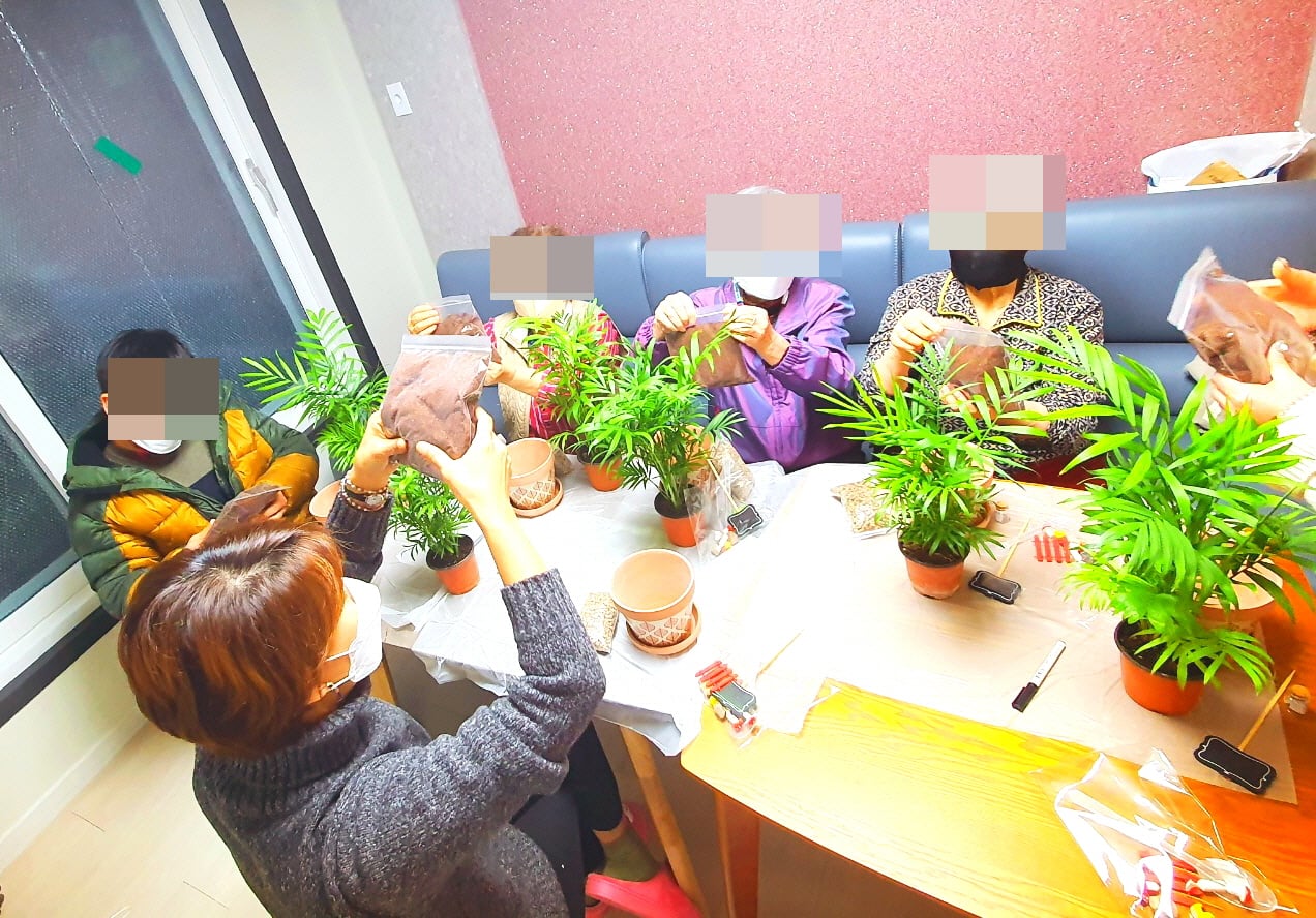 케어안심주택 입주자 5분의 인지?정서지원을 위한 원예프로그램 [푸르게 가(家)꾸는 꿈(3차)]이 진행되었습니다. 2021년도 케어안심주택 입주자들을 대상으로 인지?정서지원프로그램인 원예치료는 사회적 소외감 및 고림감 예방을 통해 지역사회 내에서의 안정적인 정착 지원을 위한 심리정서 프로그램으로 원예치료사의 식물 소개 및 관리방법 등에 대한 안내 후 입주자분들과 함께할 반려식물을 정성껏 화분에 옮겨 심었습니다. 코로나로 인해 자연을 접할 기회가 줄어들어 모두들 더없이 즐거운 시간을 보냈습니다. 반려식물 심기를 완성하고 각자의 화분에 이름을 붙여 주면서 마무리를 지었습니다. 반려식물과 함께하는 입주자분들도, 정성스럽게 화분에 담긴 반려식물도 모두 함께 편안하고 안정된 삶을 살아갈 수 있길 응원합니다. 저희 케어안심주택 입주자분들의 안정적인 생활을 위해 많은 분들의 관심과 응원 부탁드립니다.
