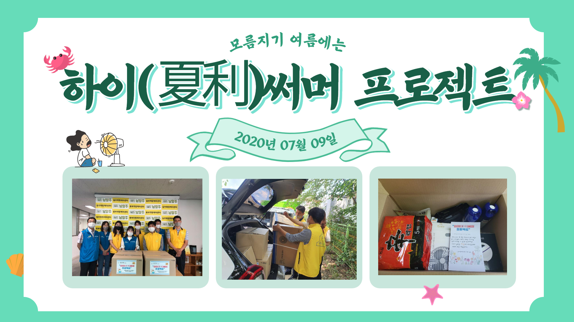 2020년 기후변화 대책사업 『하이(夏利)써머 프로젝트』의 일환으로 각 가정에 폭염대비 물품들을 전달했습니다. 폭염키트 전달은 "LH주택공사" 남양주지사 직원분들이 함께 해주셨습니다. 올해 폭염키트 물품은 경제적 어려움이 있는 한부모, 조손, 다자녀 가구에 전달이 되었으며, 이용자분들의 여름철 해충 및 폭염 물품들과 영양식을 전달하였습니다.