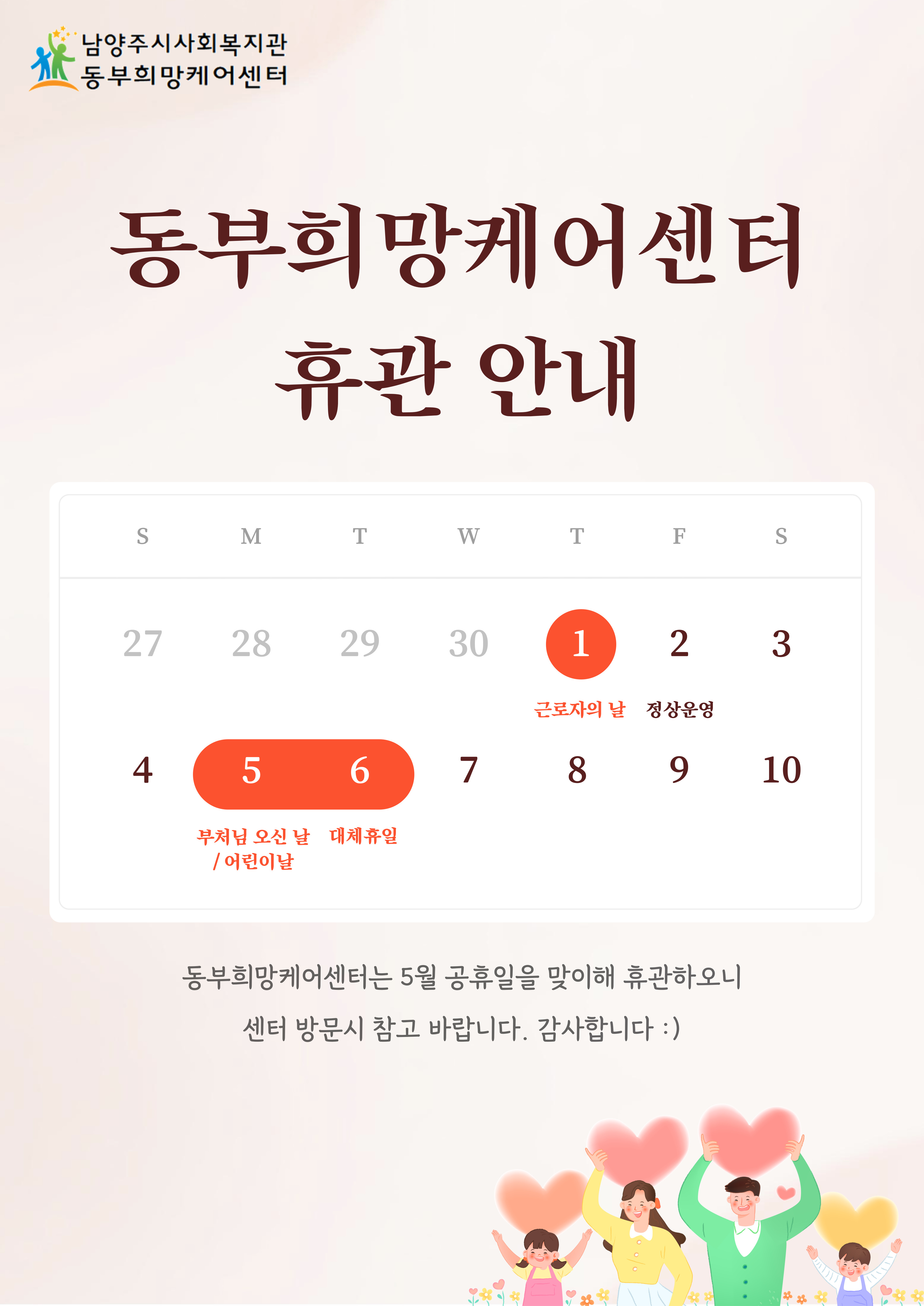 동부희망케어센터 동부희망케어센터 5월 휴관안내 등록일자 2025-04-29 조회 99 내용 안녕하세요, 동부희망케어센터 입니다. 동부희망케어센터는 5월 공휴일로 인하여 휴관 예정이오니 이용에 참고 바랍니다. 감사합니다 : ) [휴관일] ▶5/1(목) : 근로자의 날 ▶5/5(월) : 부처님오신날, 어린이날 ▶5/6(화) : 대체휴일 첨부파일 5월 휴관안내.jpg [ Size : 881.77KB, Down : 47 ] 미리보기 다운로드 목록보기