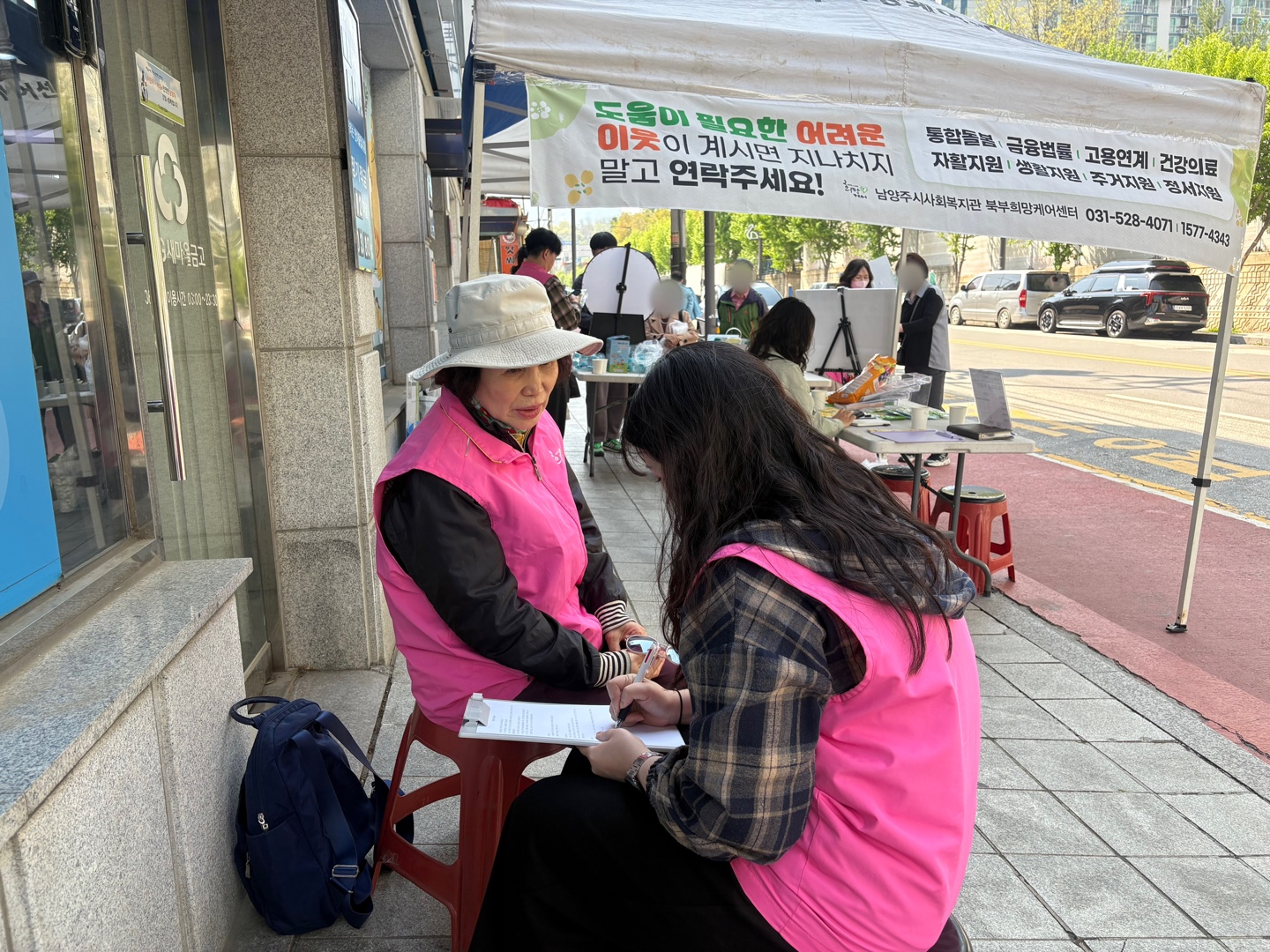 4월 25일 금요일에 별내면 소재 별내새마을금고 본점 앞에서 북부희망케어센터 직원들과 별내면사무소 맞춤형복지팀, 별내면지역사회보장협의체위원, 자원봉사자가 함께 지역주민과 만나고 소통하고자 찾아가는 복지상담, 복지퀴즈 등을 진행하였으며, 인근 빌라 및 아파트에 문고리 홍보를 진행했습니다.
