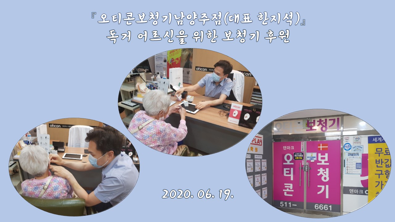 동부희망케어센터 동부희망케어센터, 오티콘보청기남양주점 후원품 전달 등록일자 2020-06-26 조회 181 내용 6월 19일에 오티콘 보청기 남양주점은 동부희망케어센터에 후원했습니다. 해주신 후원 품은 난청이 심한 독거 어르신에게 보청기를 후원했습니다. 오티콘 보청기 남양주점은 2013년 동부희망케어센터와의 협약을 시작으로 무료 청각 검진을 제공하고, 저소득 어르신에게 지속적인 보청기를 후원하고 있습니다. 첨부파일 슬라이드3.JPG [ Size : 164.33KB, Down : 53 ] 미리보기 다운로드 목록보기