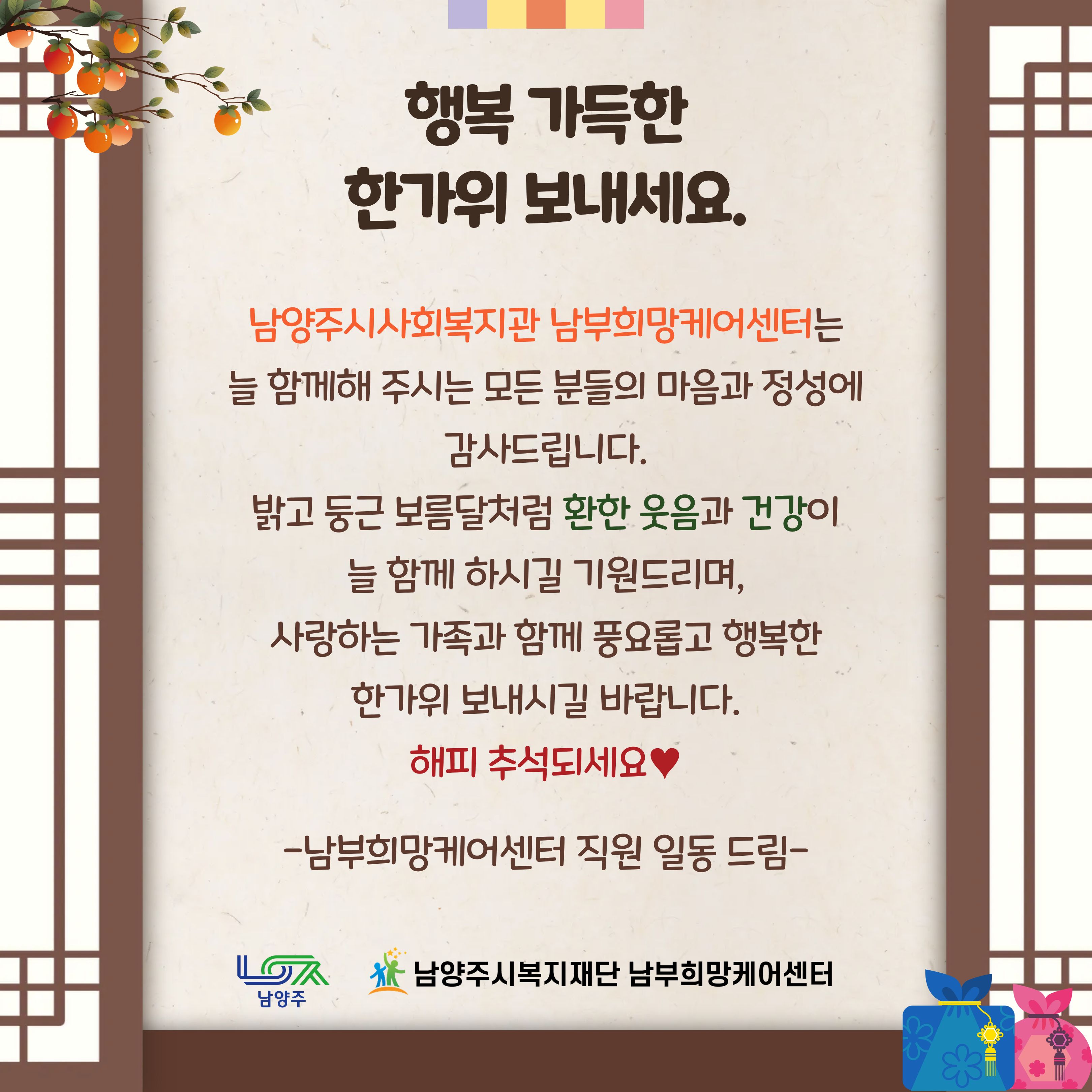 남부희망케어센터 [남부희망케어센터] 2025년 추석 한가위 인사 등록일자 2025-10-02 조회 137 내용 첨부파일 문자발송카드.jpg [ Size : 584.93KB, Down : 105 ] 미리보기 다운로드 목록보기