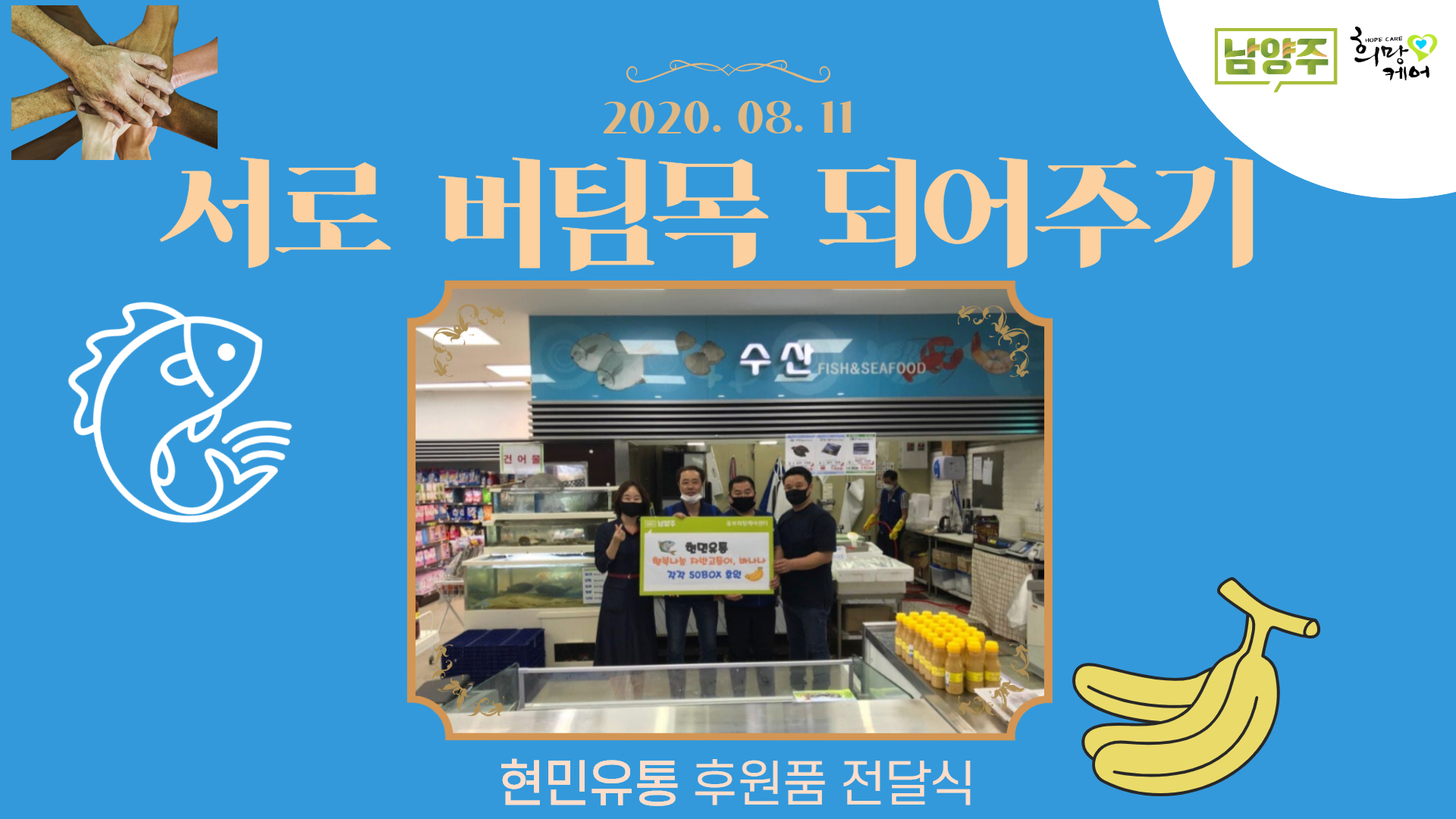 8월 11일 현민 유통 업체에서 동부희망케어센터에 후원품을 전달해 주셨습니다. 전달한 후원품은 지역주민들의 식생활 개선을 위해 고등어자반 50손과 바나나 50송이를 저희 센터에 기부해 주셨습니다. 코로나19와 집중호우로 어려움을 겪고 있을 지역주민을 위한 현민 유통 업체의 감사한 후원품 전달식이었습니다. 후원품을 전달해주셔서 감사드립니다.