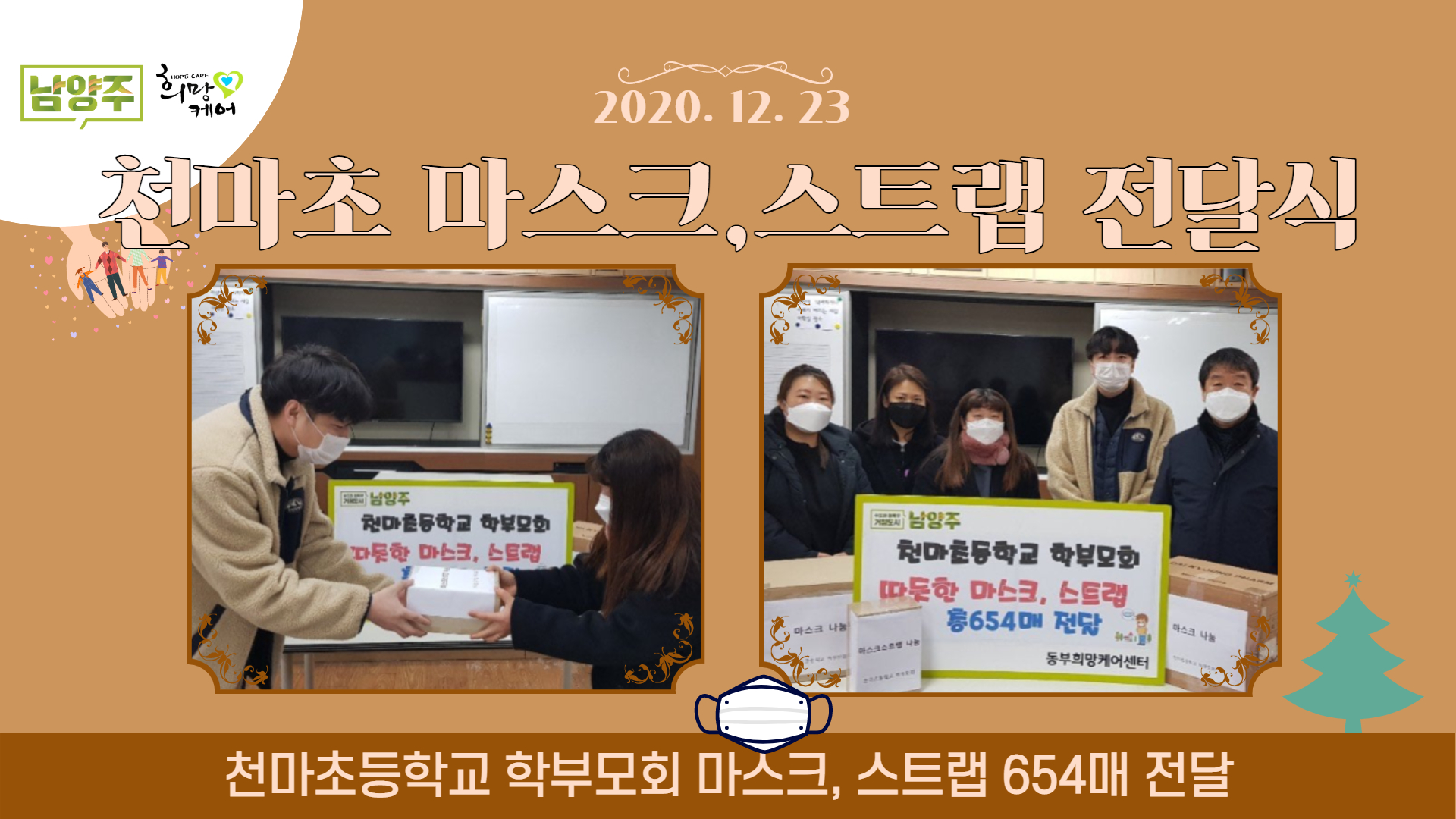 12월 23일 천마초등학교 학부모 회에서 저희 센터에 마스크 548개와 마스크 스트랩(줄) 106개를 후원해 주셨습니다. 코로나19가 심각해지고 있음에 따라 마스크를 필요로 하시는 분들이 계실 것 같아 후원을 결정하게 되었다고 하셨습니다. 학부모회 분들에게 감사의 인사를 드리며 후원해 주신 물품은 잘 전달해드리도록 하겠습니다. 감사합니다.