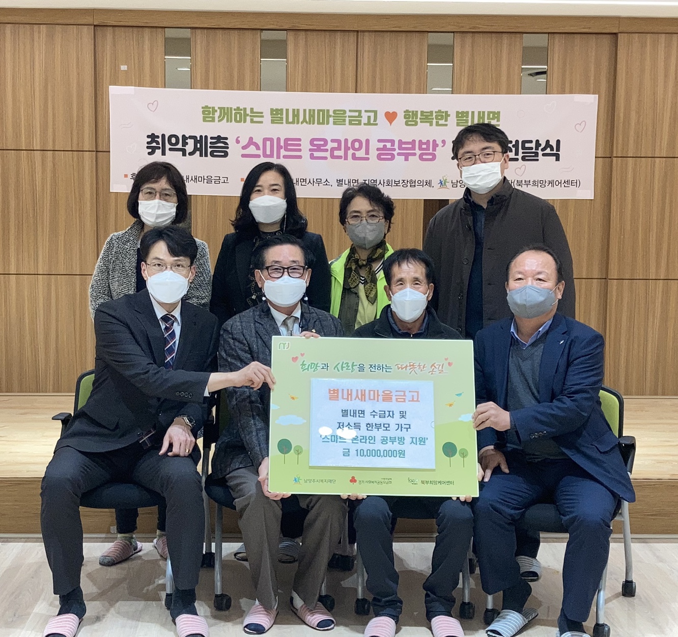 북부희망케어센터(센터장 전정수)는 30일(수) MG별내새마을금고(이사장 남경우)와 기초생활수급자 아동의 학습권을 보장하고 학습 격차 예방과 학습능률 향상을 위해 나만의 공부방 공간을 마련하여 저소득층 자녀의 학습 사각지대를 해소하고자 나만의 스마트 온라인 공부방 지원 전달식을 진행하였습니다. 스마트 온라인 공부방 지원은 별내면 지역의 소외계층 아이들 16가구에게 지원될 예정이며, 책상, 의자, 책장 등 공부방을 조성하여 학습 환경을 개선하고자 합니다. 별내동, 면 지역의 발전을 위해 지속적인 나눔을 실천해주시는MG별내새마을금고에게 다시한번 감사인사 드립니다.