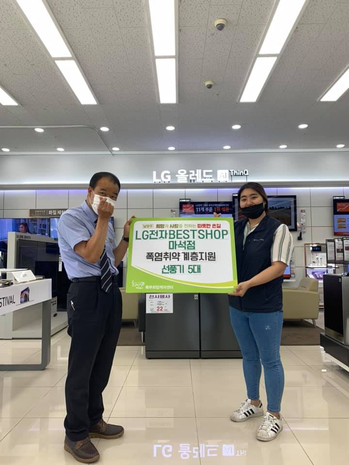 북부희망케어센터에서는 다가올 폭염을 예방하기 위해 전달식을 진행하였다. LG전자 BEST SHOP 마석점(지점장 황기특)에서 더운 여름 폭염 속에서 지쳐있을 북부권역 폭염 취약계층을 위해 선풍기 5대와 서큘레이터 1대를 북부희망케어센터에 전달해주셨다. 전달해주신 선풍기와 서큘레이터는 북부권역의 폭염 취약계층에게 사용 될 예정이다. LG전자 BEST SHOP 마석점 확기특 지점장님은 선풍기 뿐 아니라 현재 남양주시에서 진행하고 있는 스마트기기 지원에도 많은 도움을 주셨다.