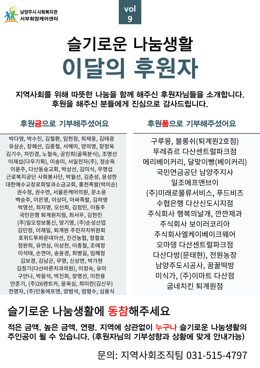 서부희망케어센터 슬기로운 나눔생활, 이달의 후원자_9월